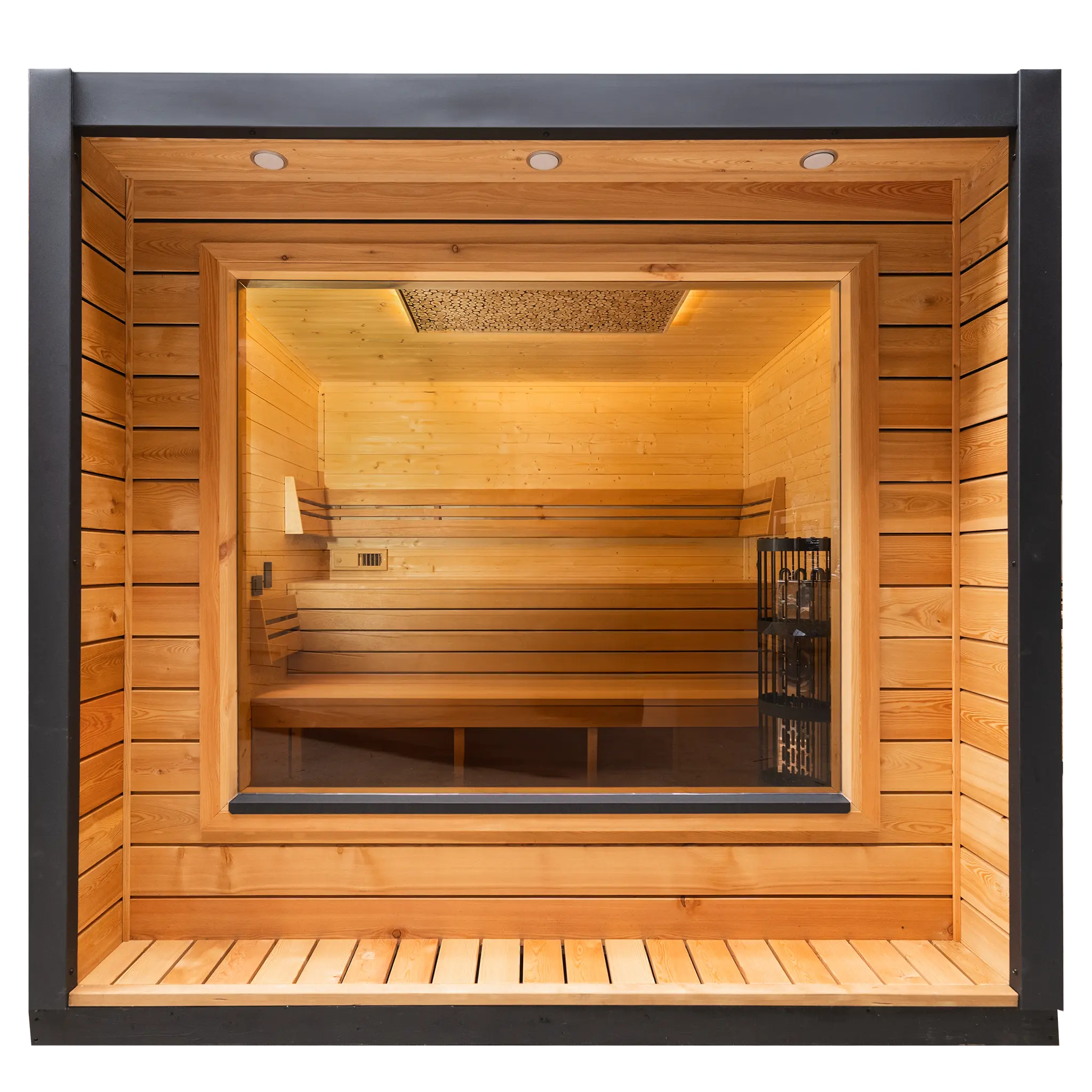 Die Cube Gartensauna aus der Koba-Serie überzeugt mit kompakter Form, moderner Architektur und großzügiger Panoramaverglasung. Ideal für stilvolle Gärten mit klarer Linienführung.