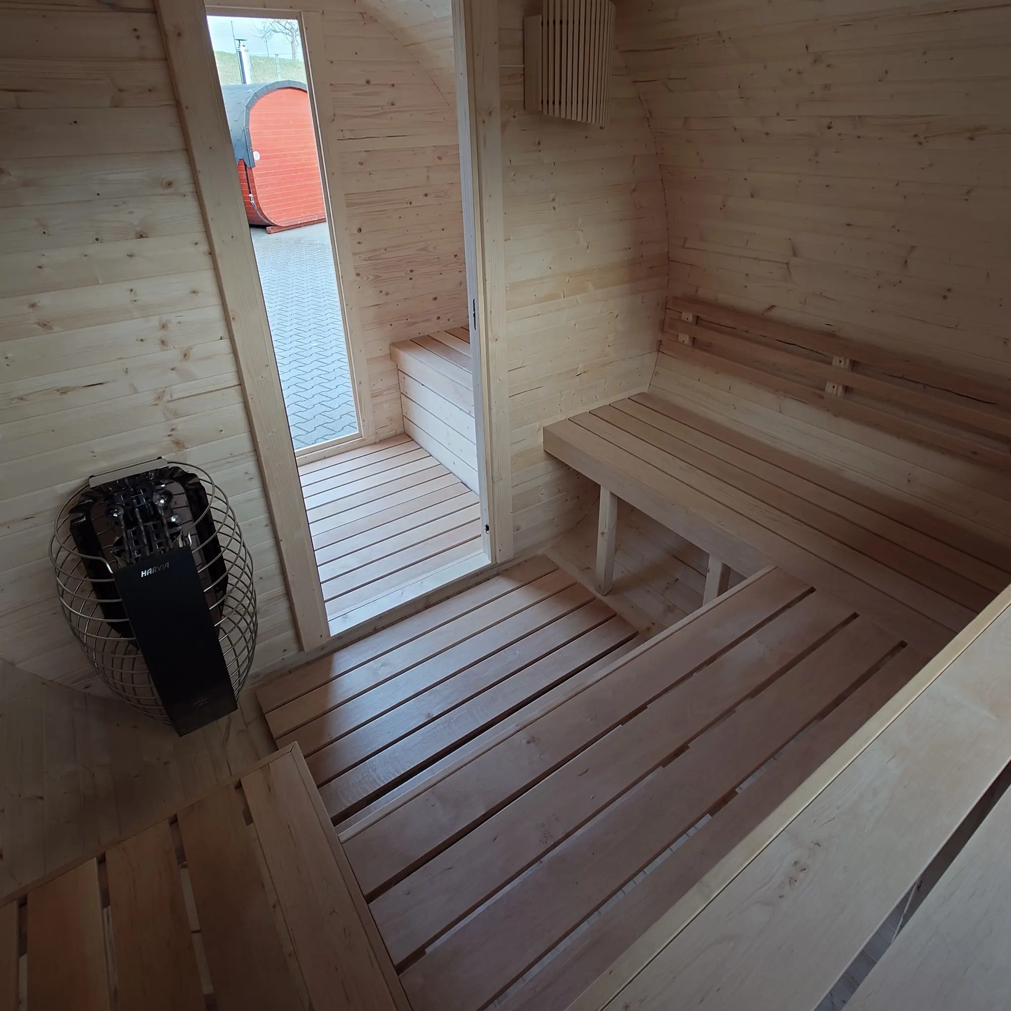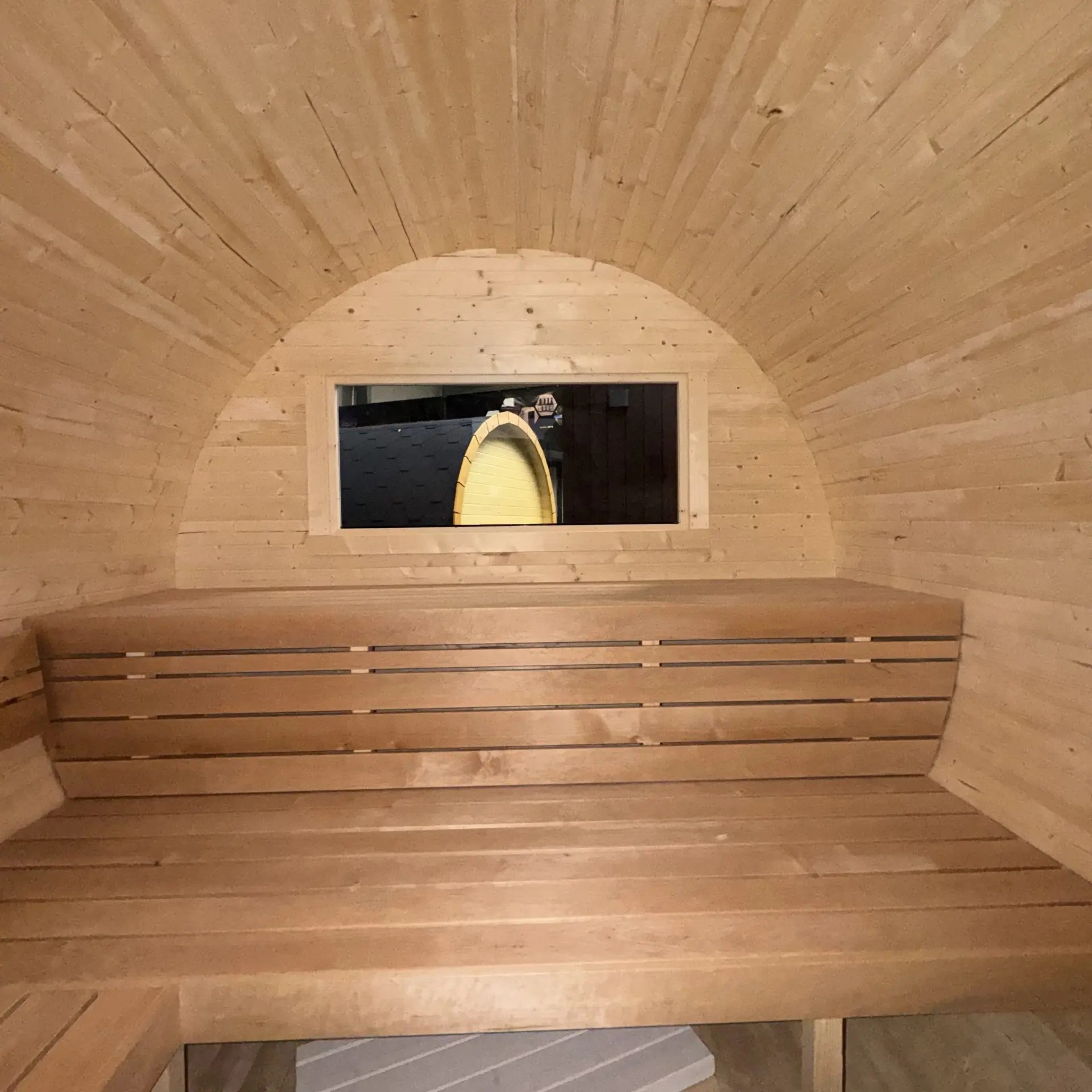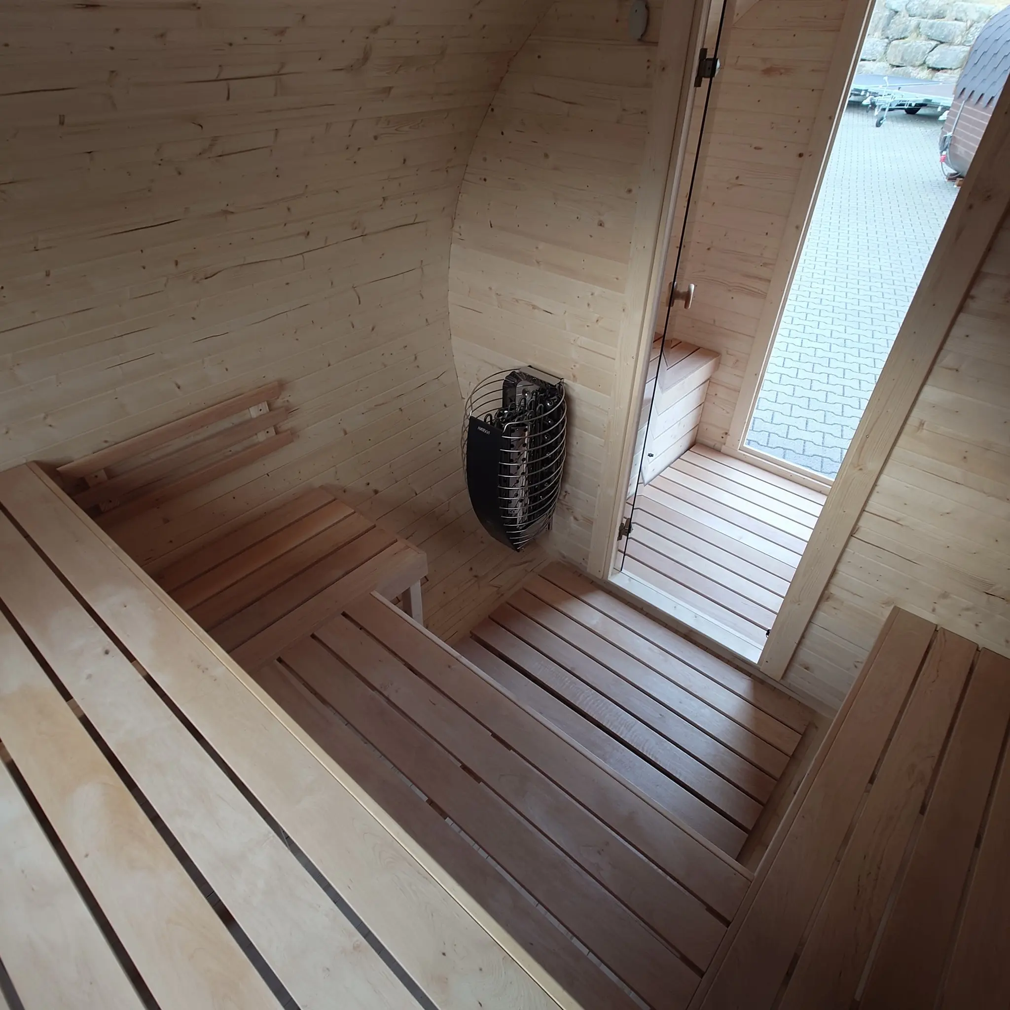 Die charakteristische Form sorgt für eine gleichmäßige Wärmeverteilung im Innenraum und unterstützt ein angenehmes, intensives Saunaklima. Je nach Ausführung ist die 3/4 Fass Gartensauna als reiner Saunaraum oder mit zusätzlicher Terrasse und/oder Vorraum erhältlich. Die Liegen sind wahlweise in L- oder U-Form angeordnet und bieten komfortable Sitz- und Liegeflächen für mehrere Personen.