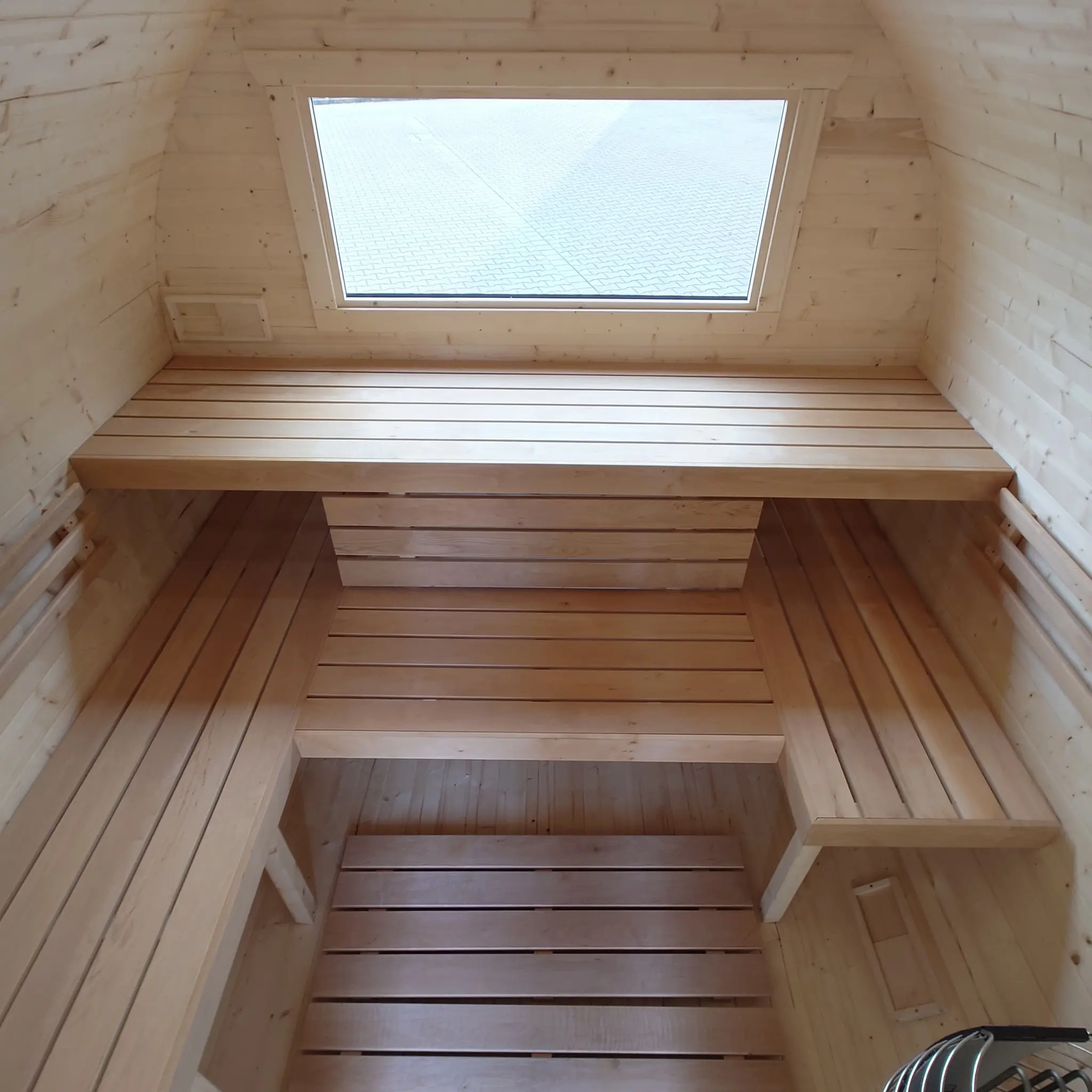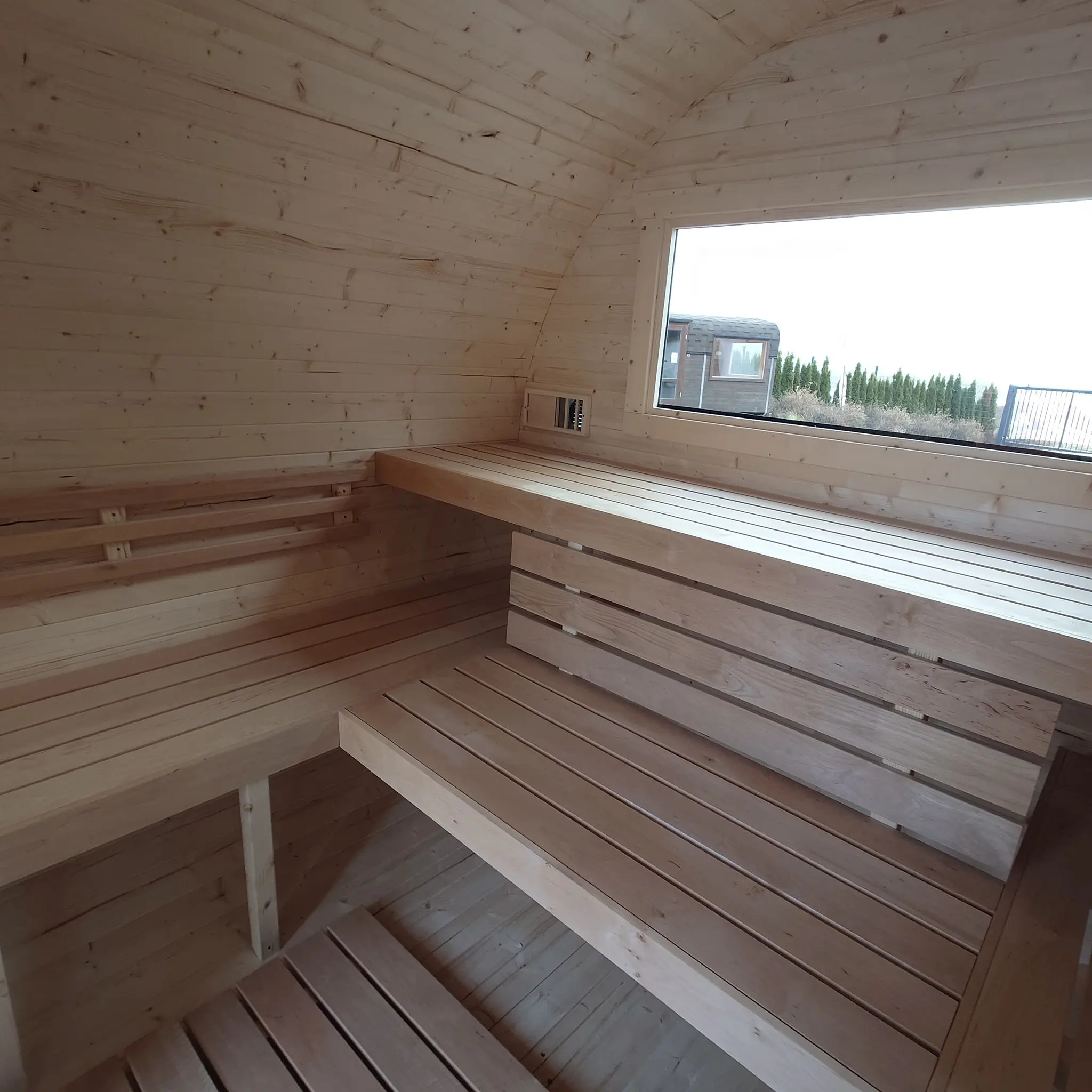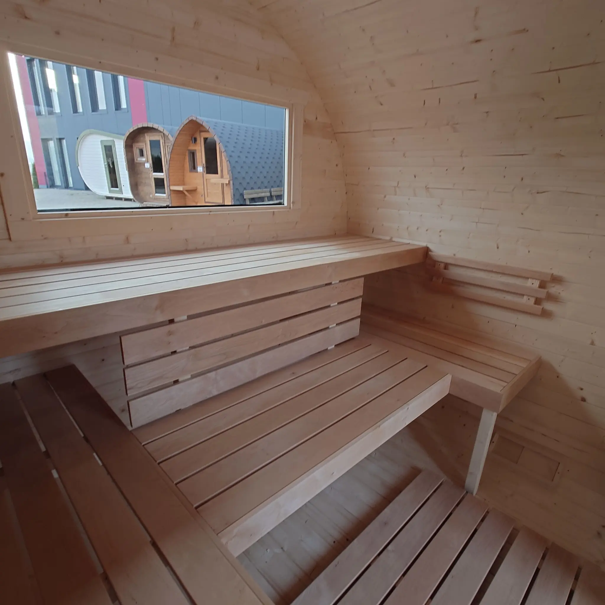 Die charakteristische Form sorgt für eine gleichmäßige Wärmeverteilung im Innenraum und unterstützt ein angenehmes, intensives Saunaklima. Je nach Ausführung ist die 3/4 Fass Gartensauna als reiner Saunaraum oder mit zusätzlicher Terrasse und/oder Vorraum erhältlich. Die Liegen sind wahlweise in L- oder U-Form angeordnet und bieten komfortable Sitz- und Liegeflächen für mehrere Personen.