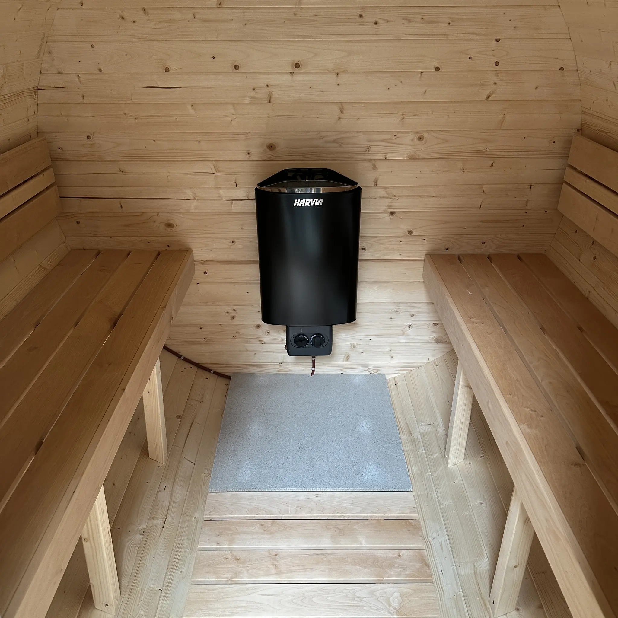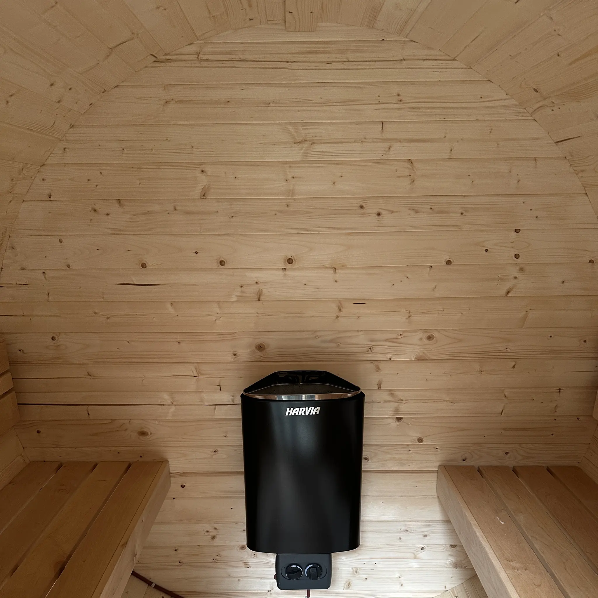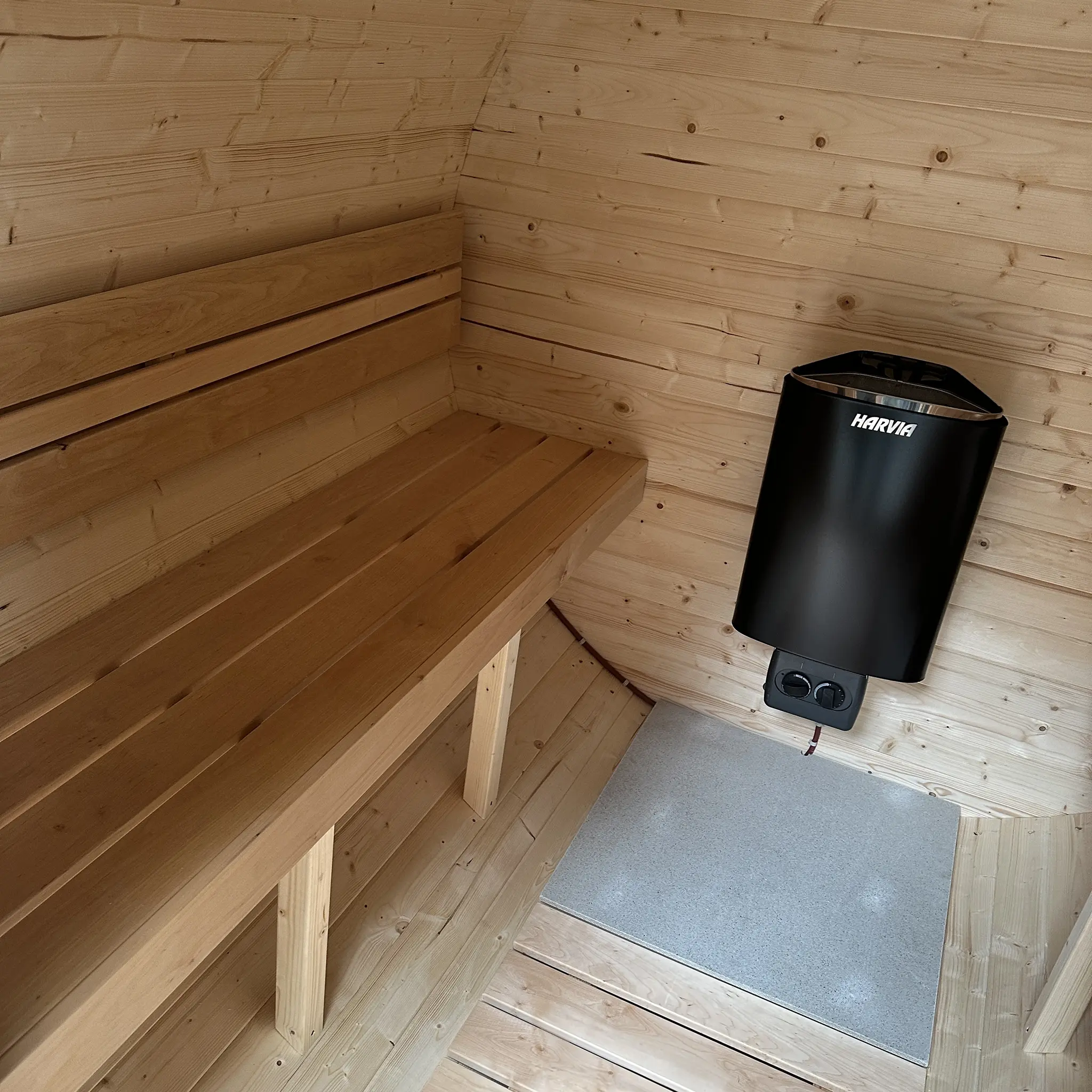 Fenster sind bei diesem Modell konstruktionsbedingt nicht vorgesehen. Die Mini Fasssauna ist für den Betrieb mit einem Elektroofen ausgelegt. Die empfohlene Ofenleistung liegt bei 3,5 bis 4,5 kW und ermöglicht ein effizientes und angenehmes Saunieren.