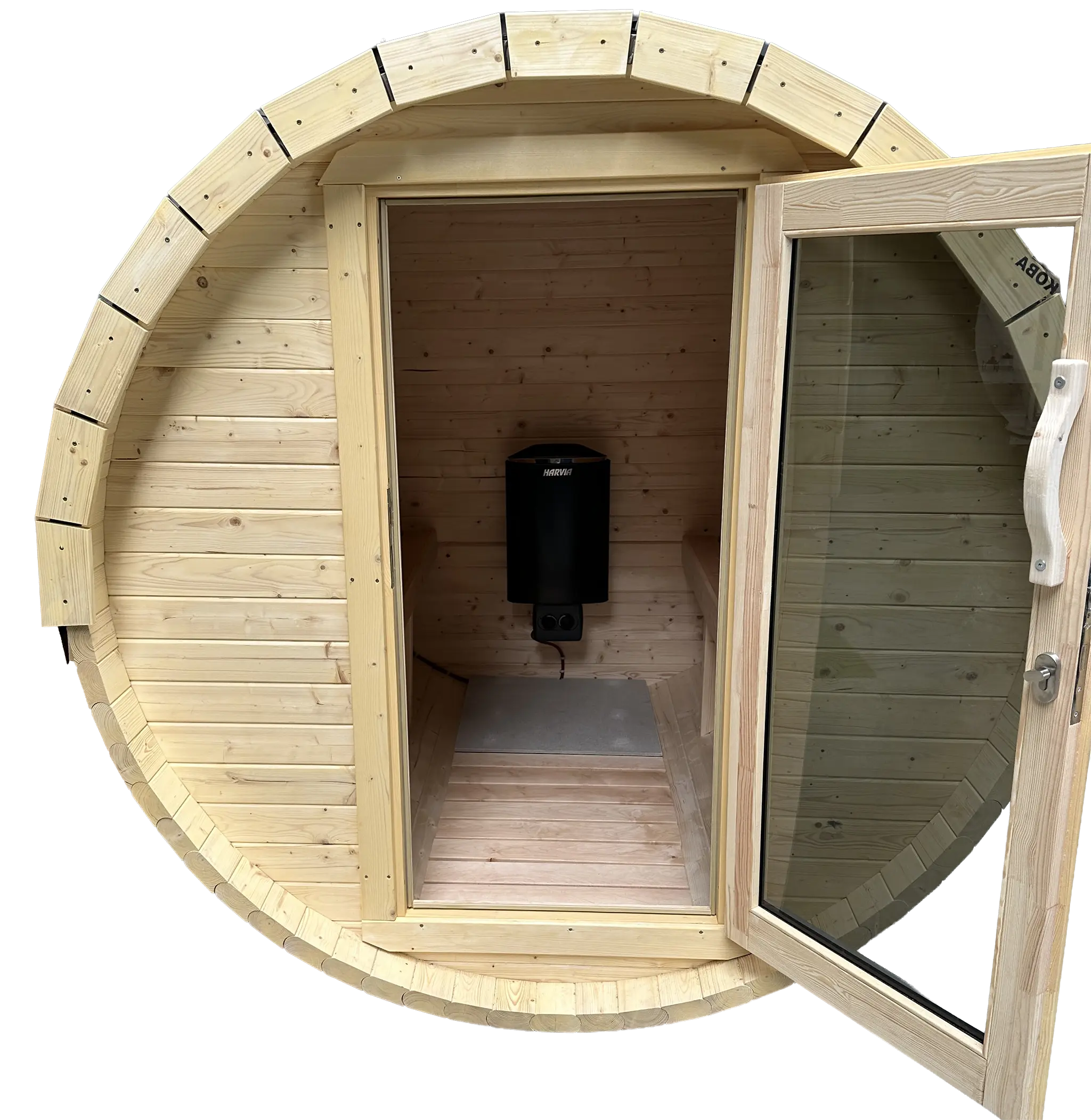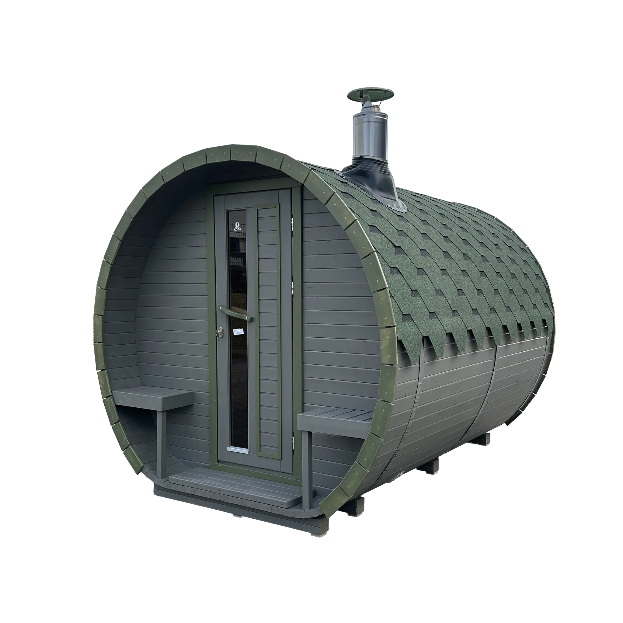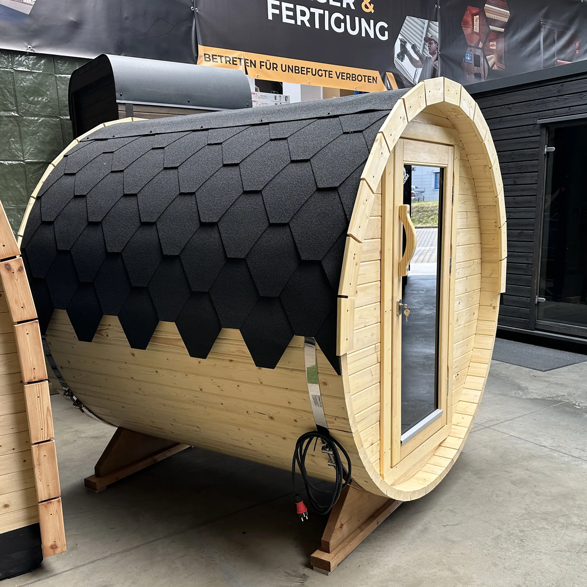 Fenster sind bei diesem Modell konstruktionsbedingt nicht vorgesehen. Die Mini Fasssauna ist für den Betrieb mit einem Elektroofen ausgelegt. Die empfohlene Ofenleistung liegt bei 3,5 bis 4,5 kW und ermöglicht ein effizientes und angenehmes Saunieren.