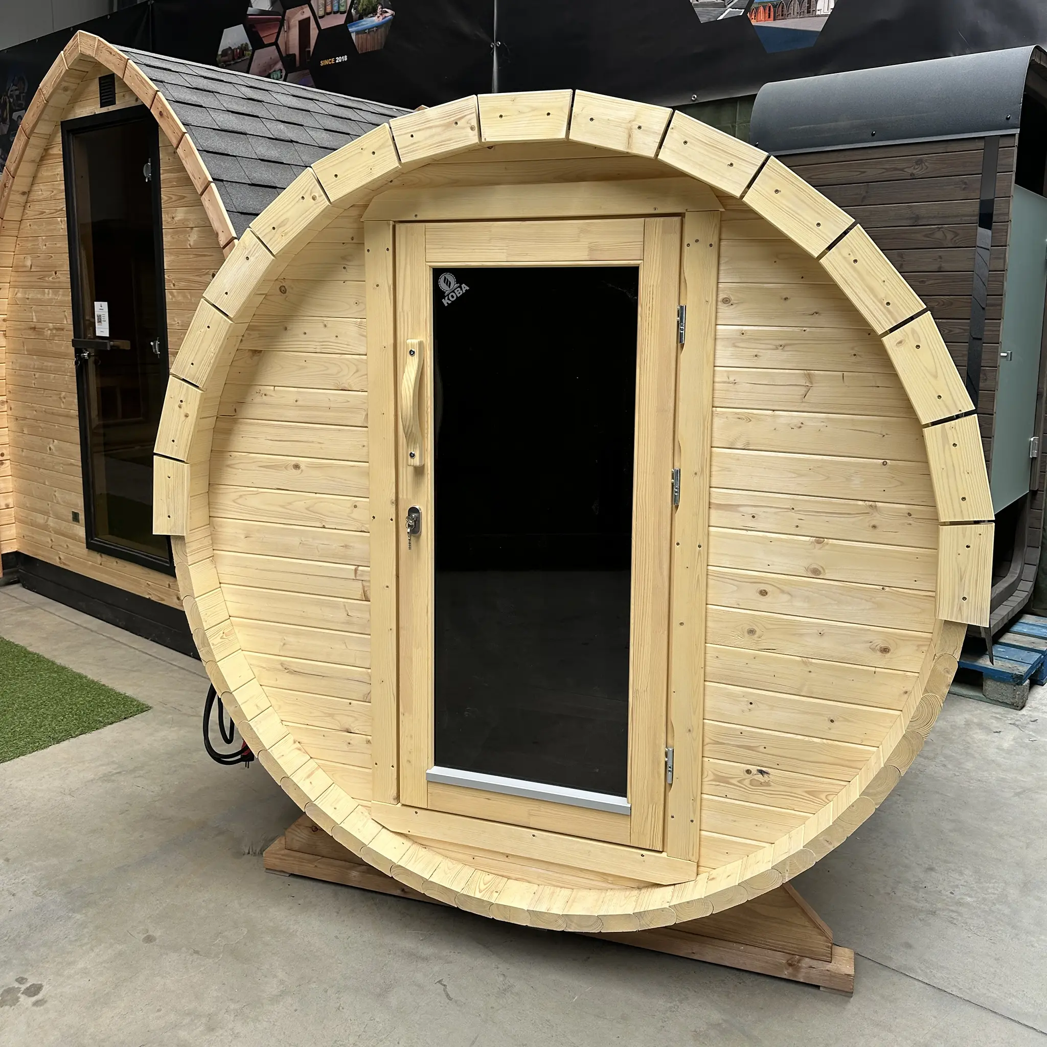 Die runde Form sorgt für eine gleichmäßige Wärmeverteilung im Innenraum und schafft ein angenehmes, intensives Saunaklima. Die Liegen sind in klassischer Anordnung links und rechts angeordnet und bieten trotz der kompakten Abmessungen einen komfortablen Saunaraum.