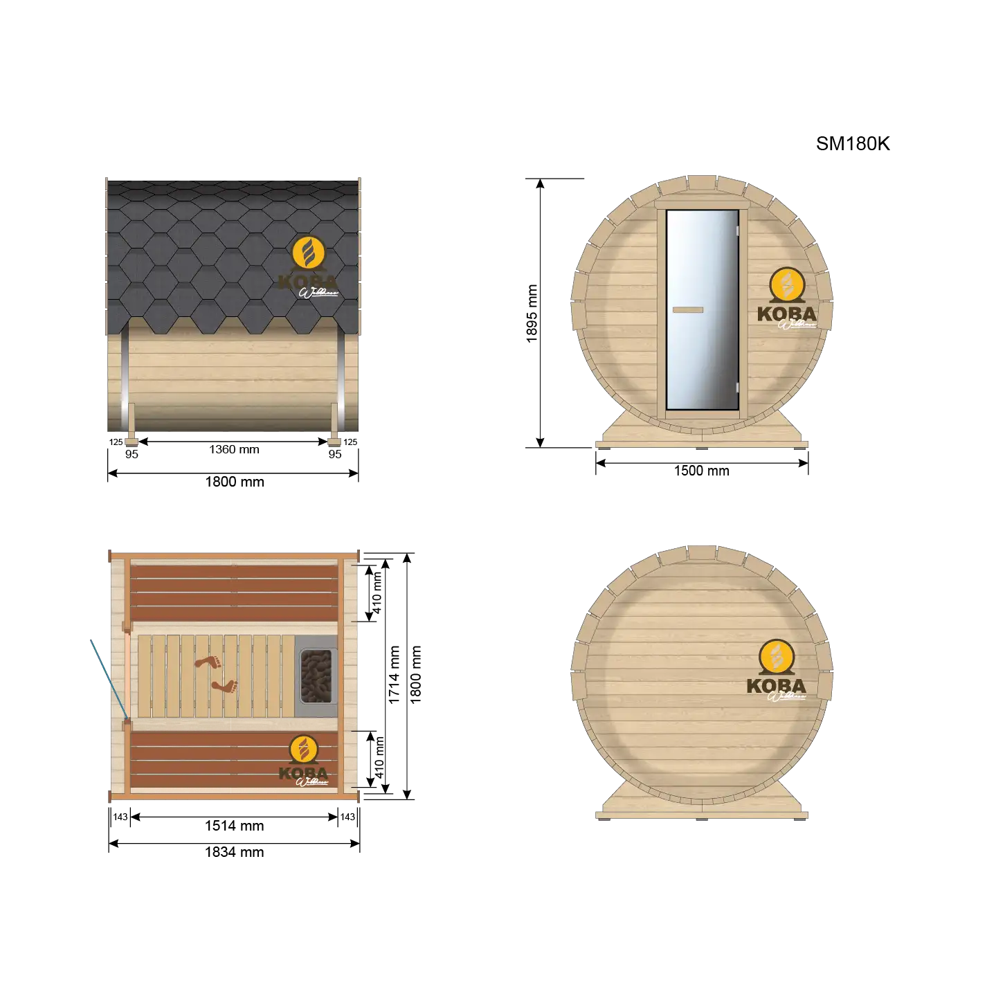 Die Holzkonstruktion der Mini Fasssauna besteht aus Fichte, während Bänke, Bodenrost und Rückenlehnen aus Erle gefertigt sind. Mit einer Länge von 1,80 Metern bietet sie eine platzsparende, aber vollwertige Lösung für den privaten Saunabereich.
