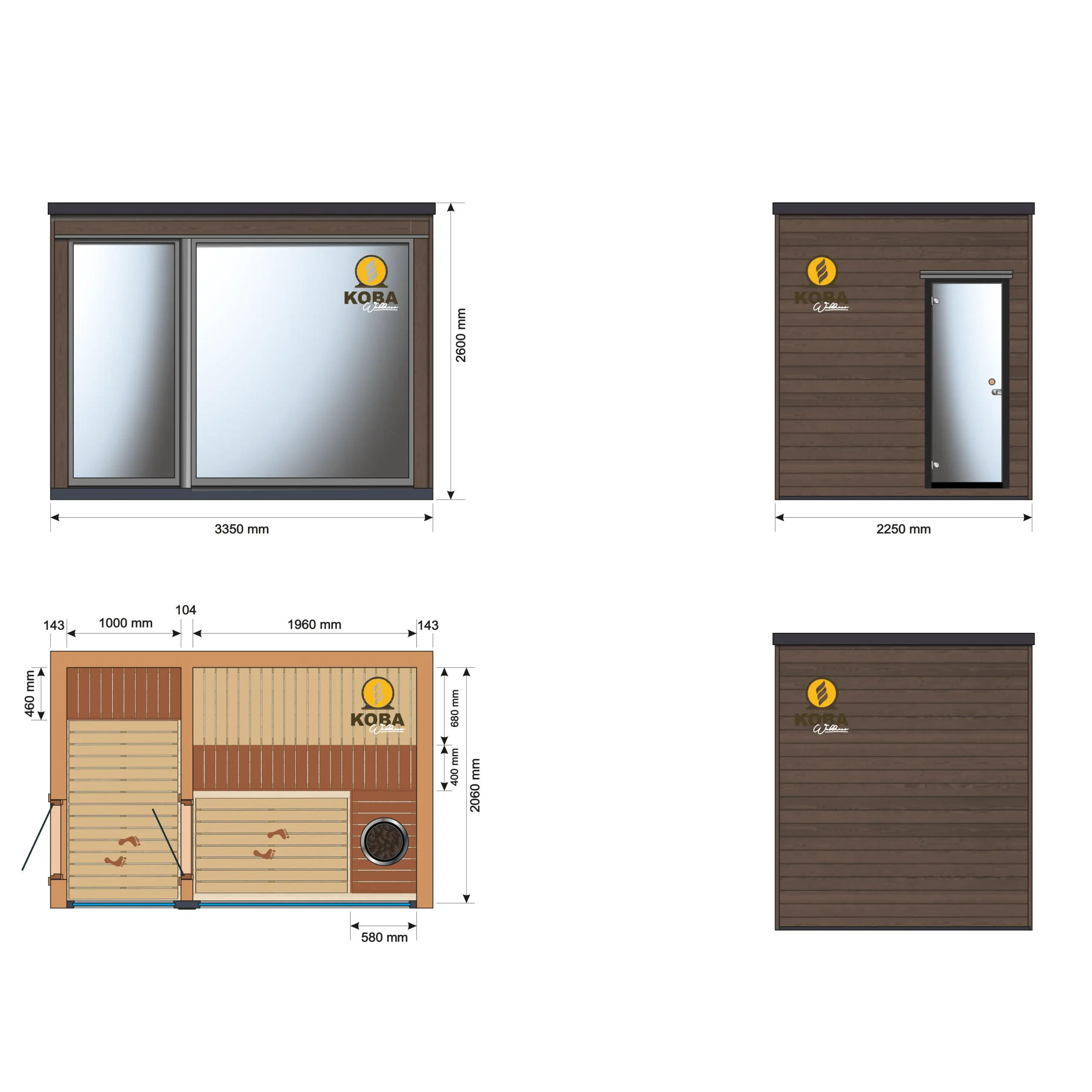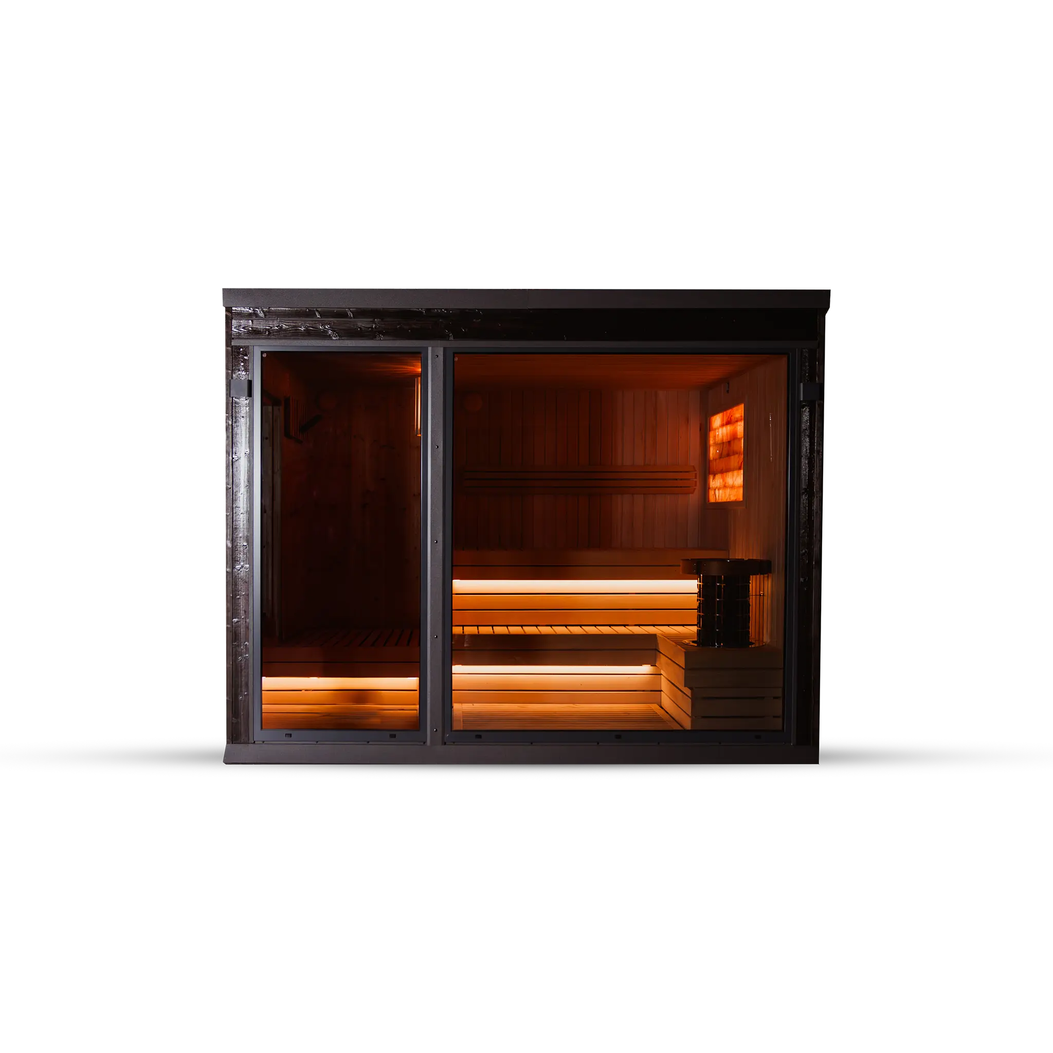 Das Modell verfügt über zwei klar getrennte Bereiche: einen großzügigen Saunaraum sowie einen separaten Vorraum. Der Vorraum mit einer Länge von 1000 mm schafft eine funktionale Übergangszone, die als Umkleide- oder Ruhebereich genutzt werden kann und gleichzeitig für ein stabiles Saunaklima sorgt.