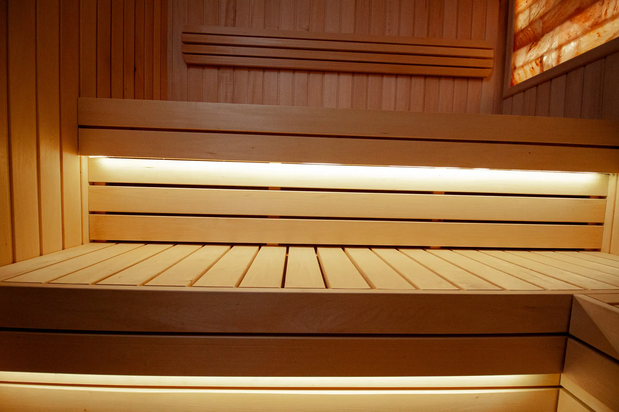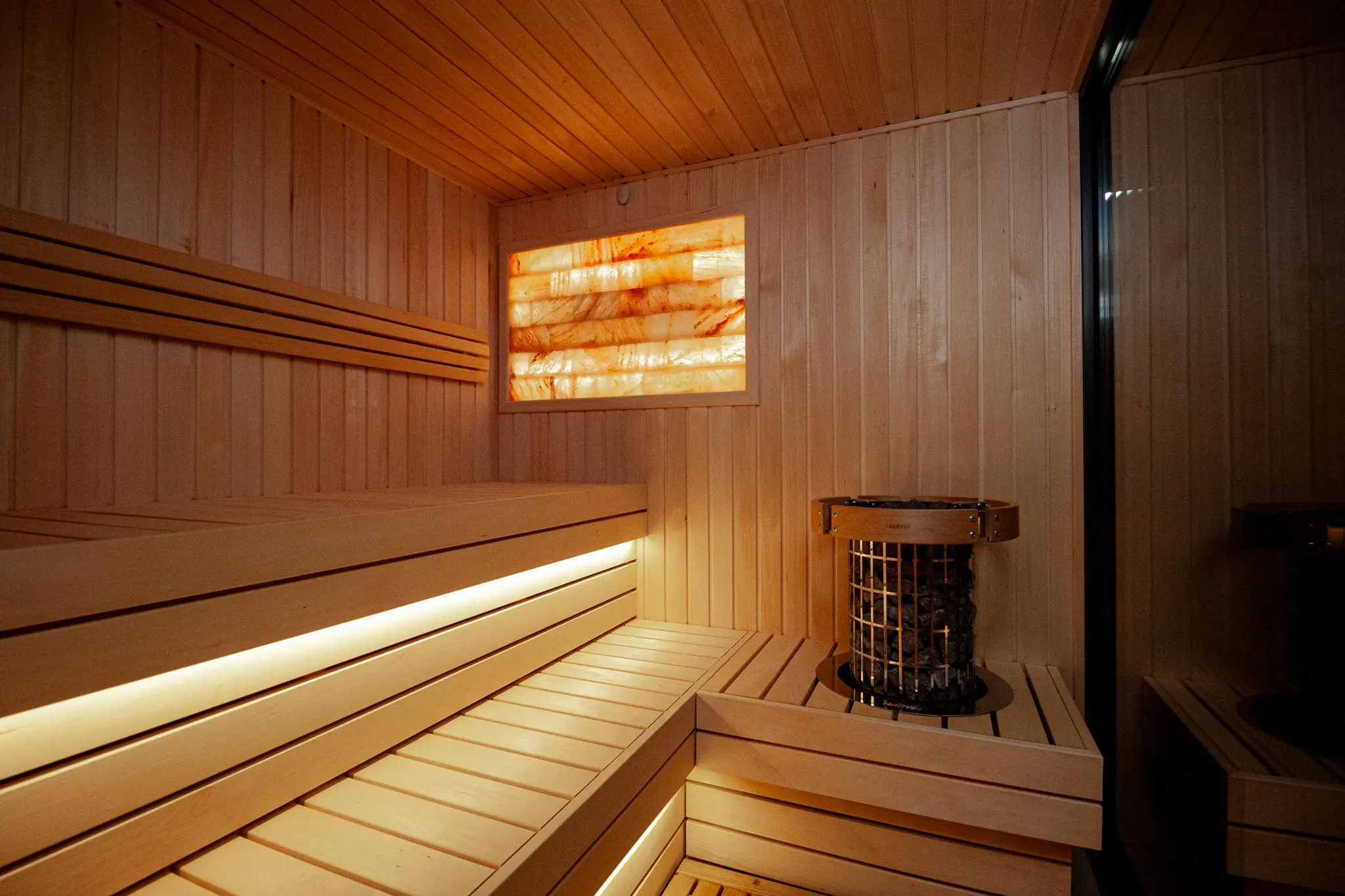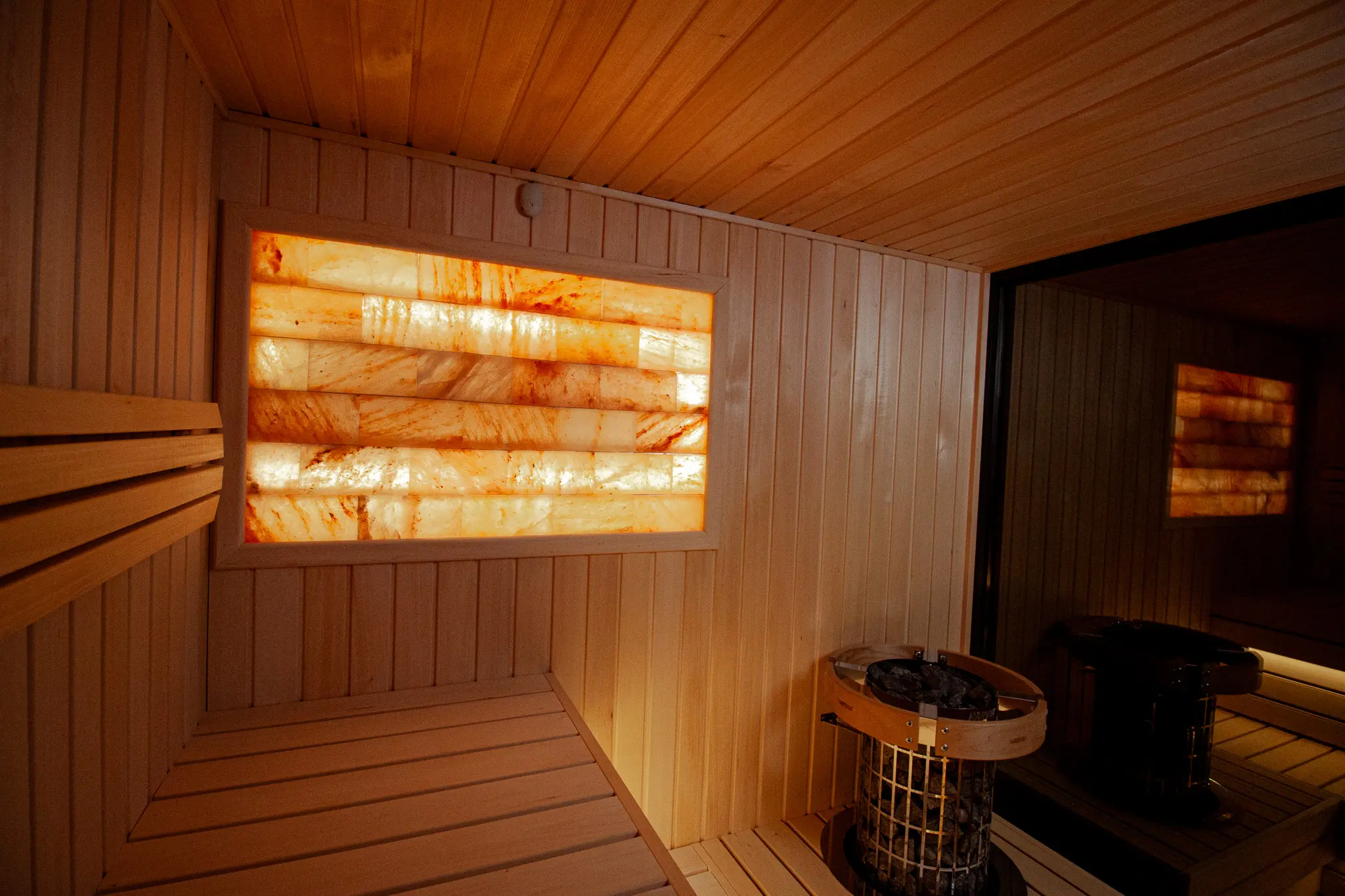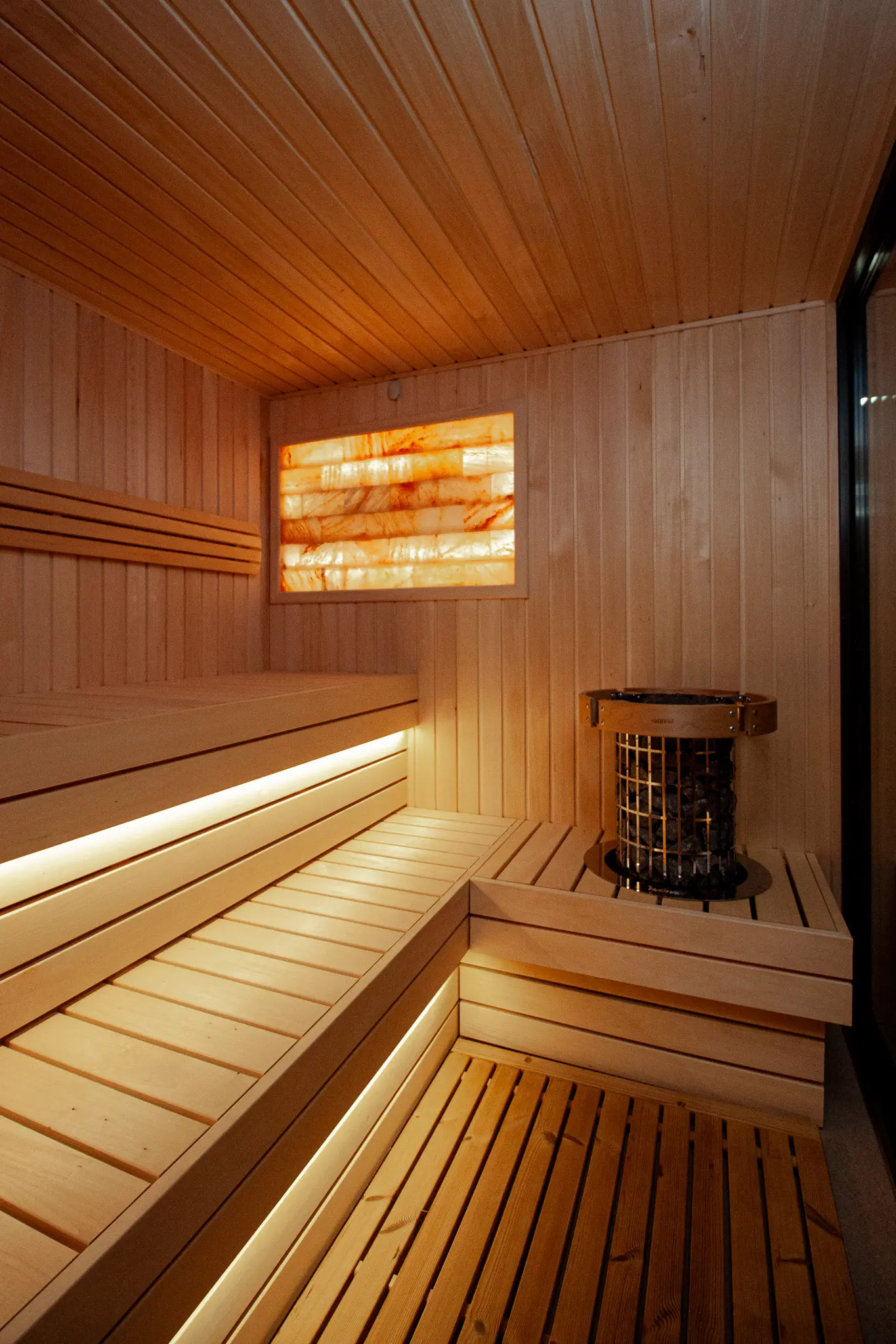 Besondere Highlights sind das beleuchtete Salzelement sowie das durchdachte Beleuchtungskonzept mit LED-Licht unter den Saunabänken, in den Rückenlehnen sowie unter dem Dach. Zusätzlich sorgt eine Außenleuchte für eine angenehme Beleuchtung im Eingangsbereich.