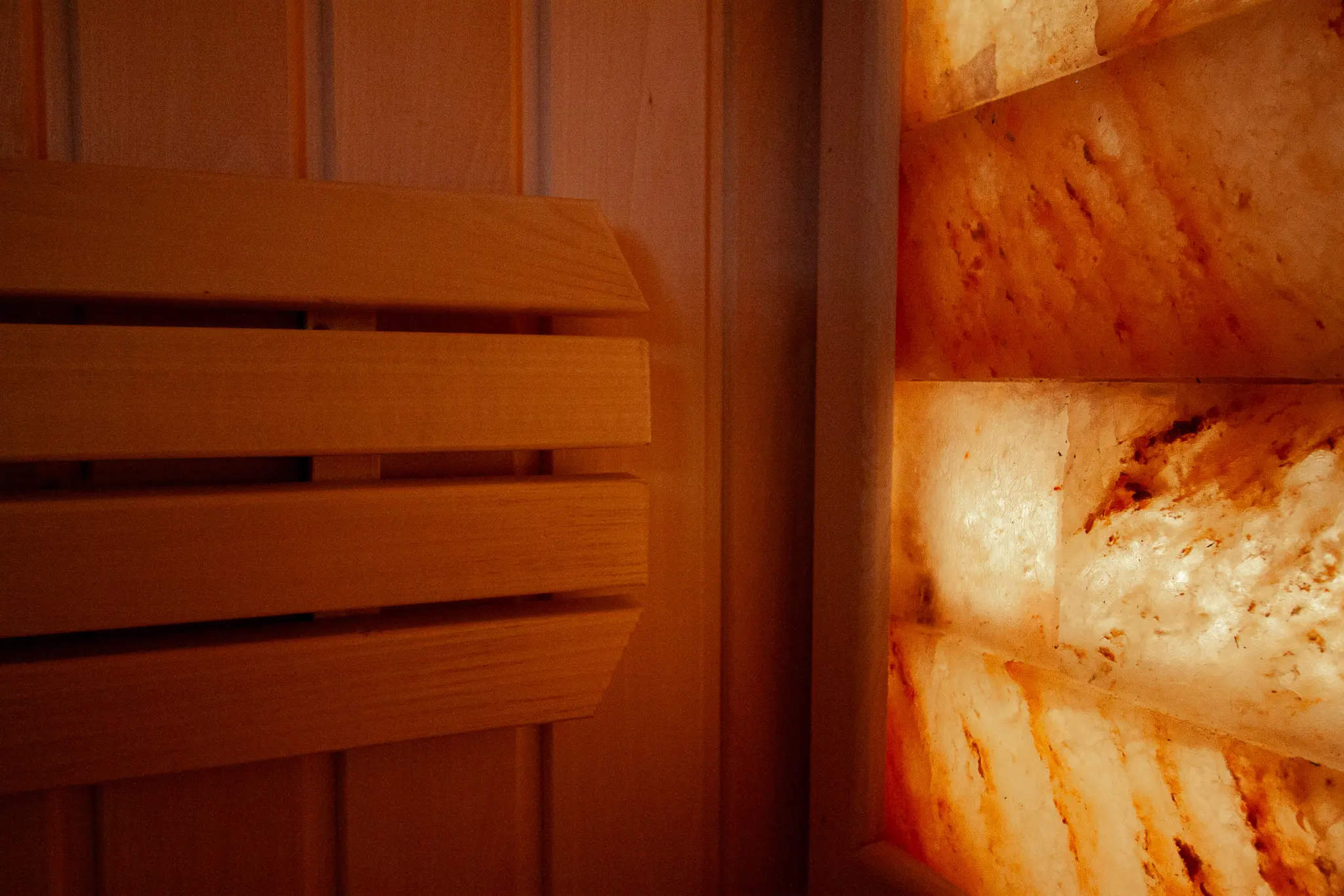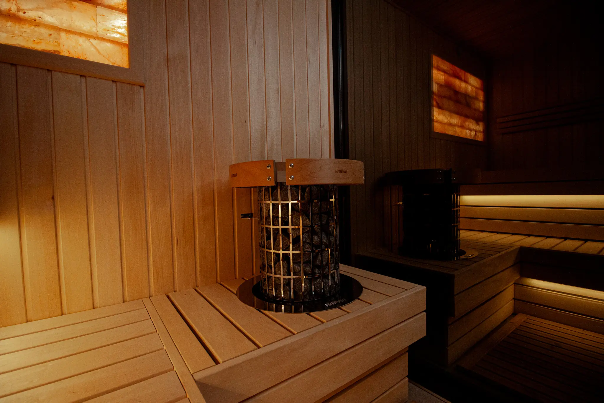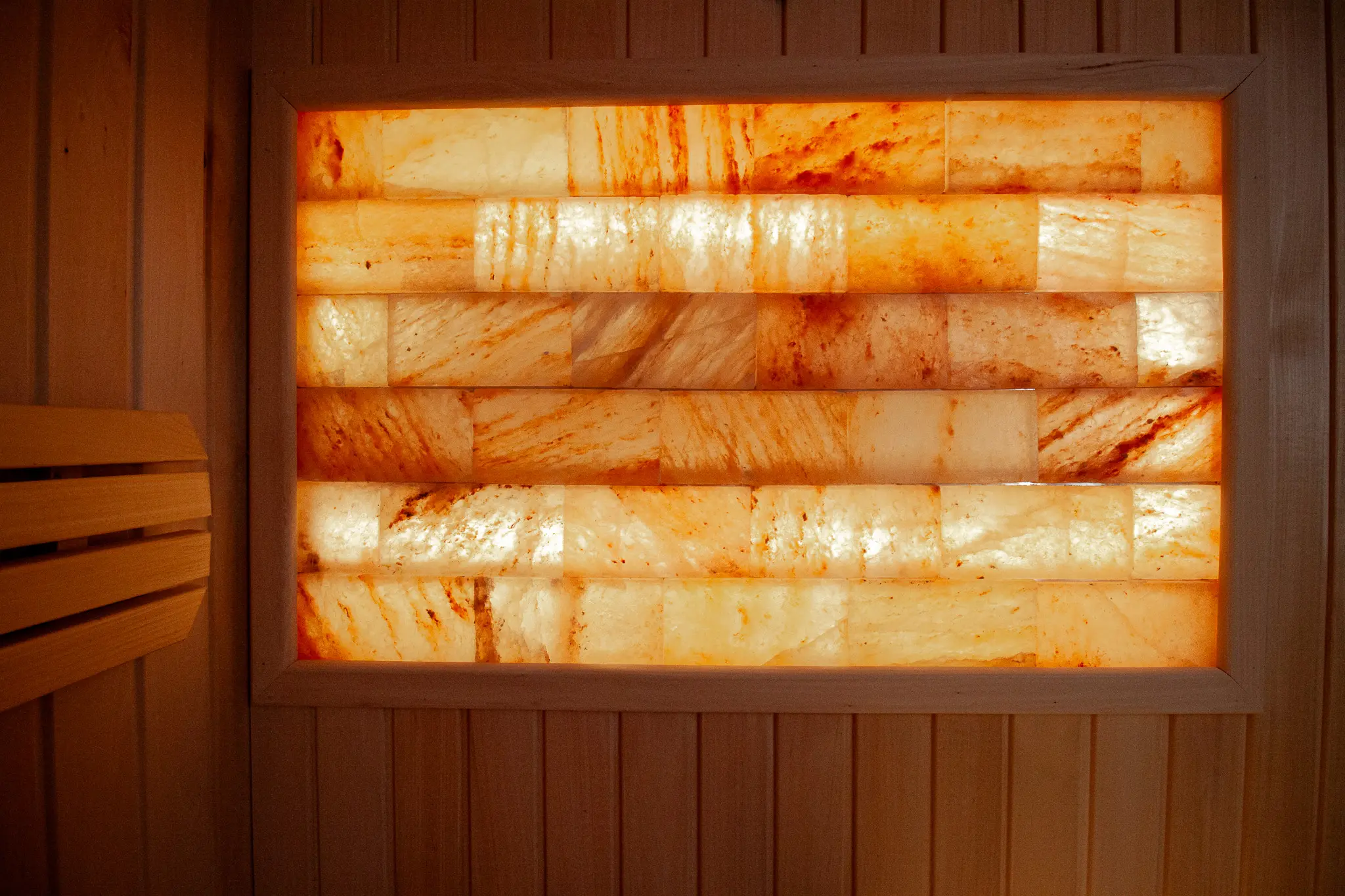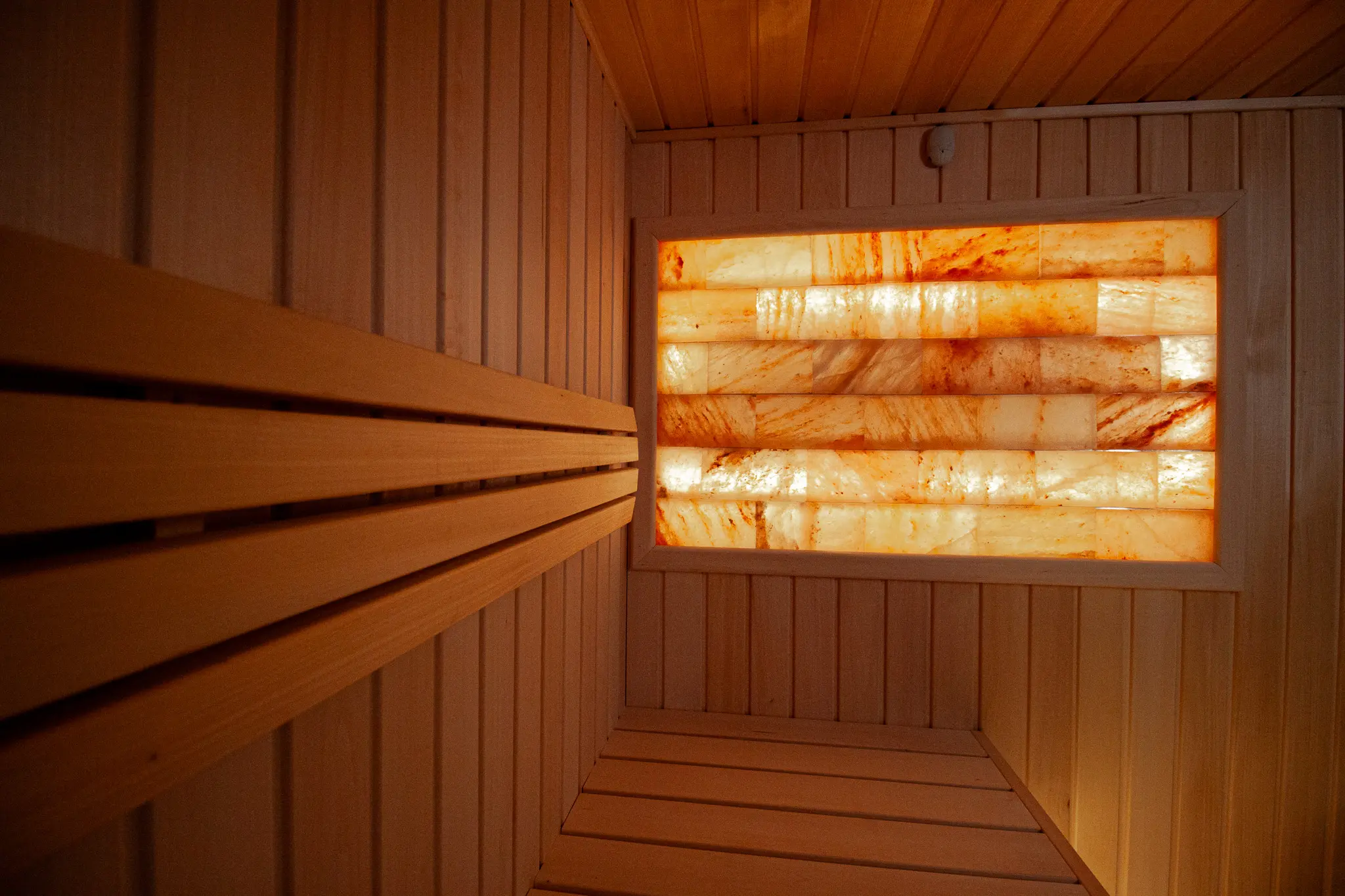 Besondere Highlights sind das beleuchtete Salzelement sowie das durchdachte Beleuchtungskonzept mit LED-Licht unter den Saunabänken, in den Rückenlehnen sowie unter dem Dach. Zusätzlich sorgt eine Außenleuchte für eine angenehme Beleuchtung im Eingangsbereich.