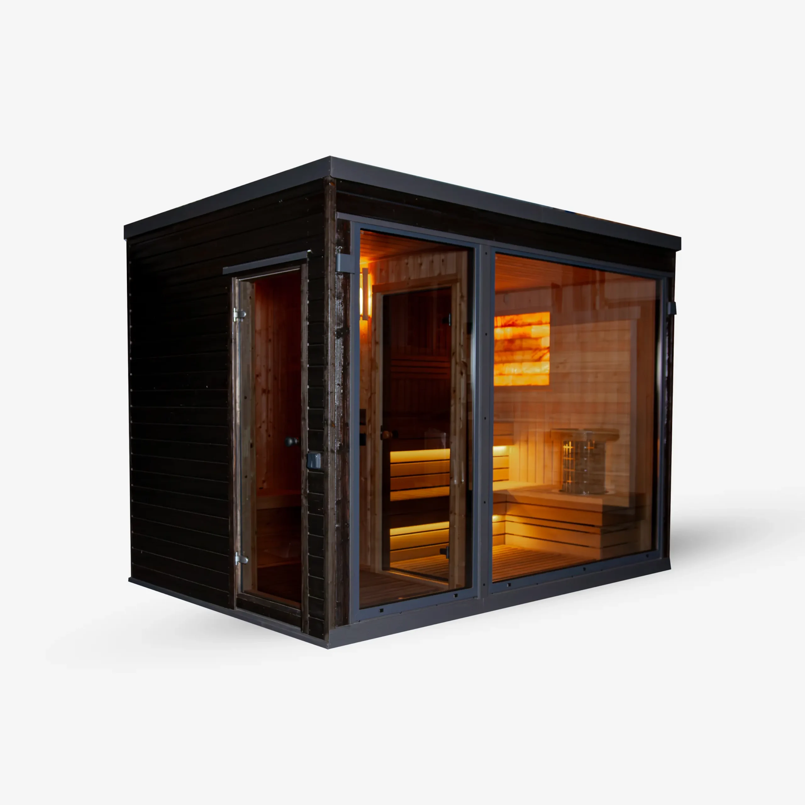 Für eine hochwertige Optik und gute Wärmedämmung verfügt die Sauna über zweifach verglaste Elemente mit Aluminiumrahmen.