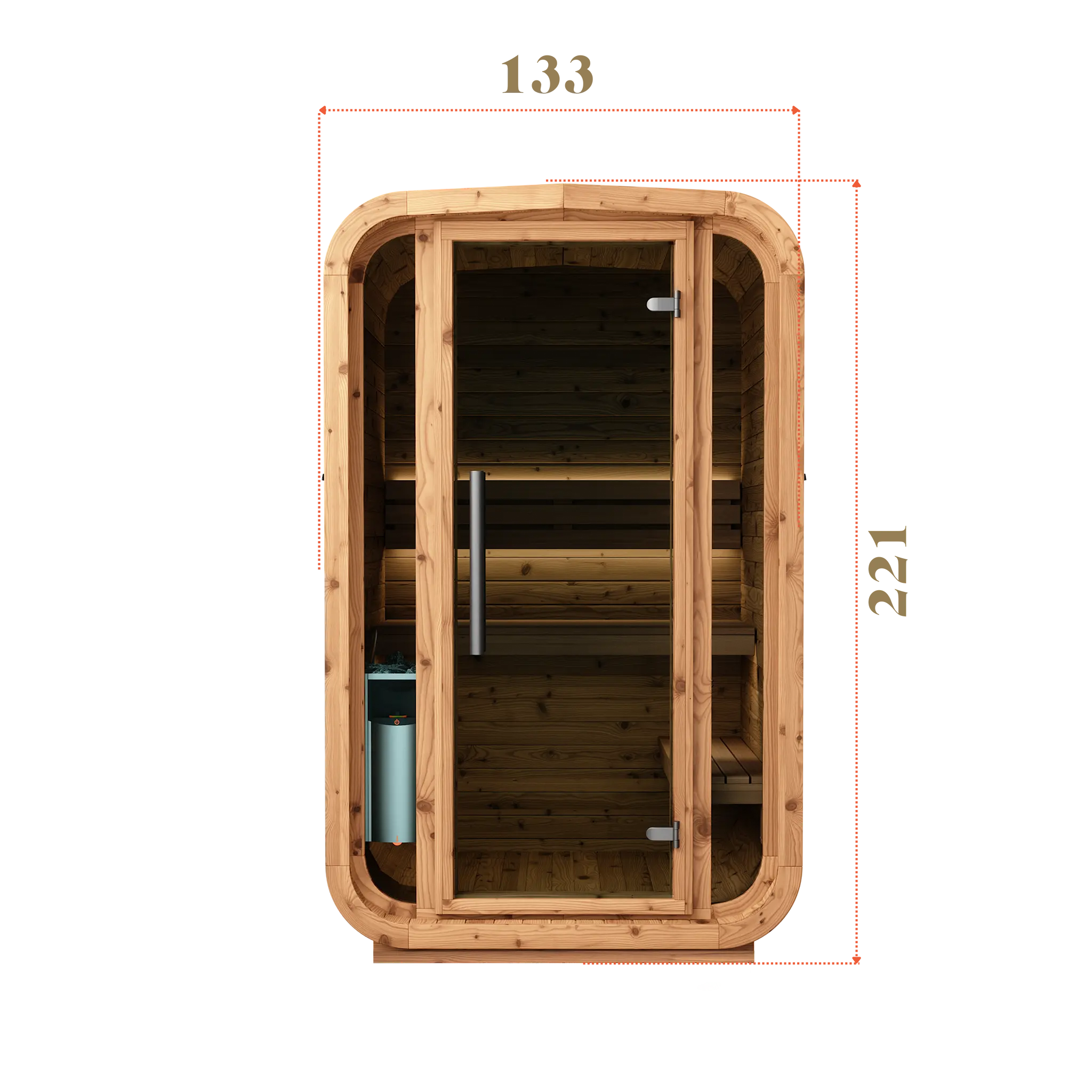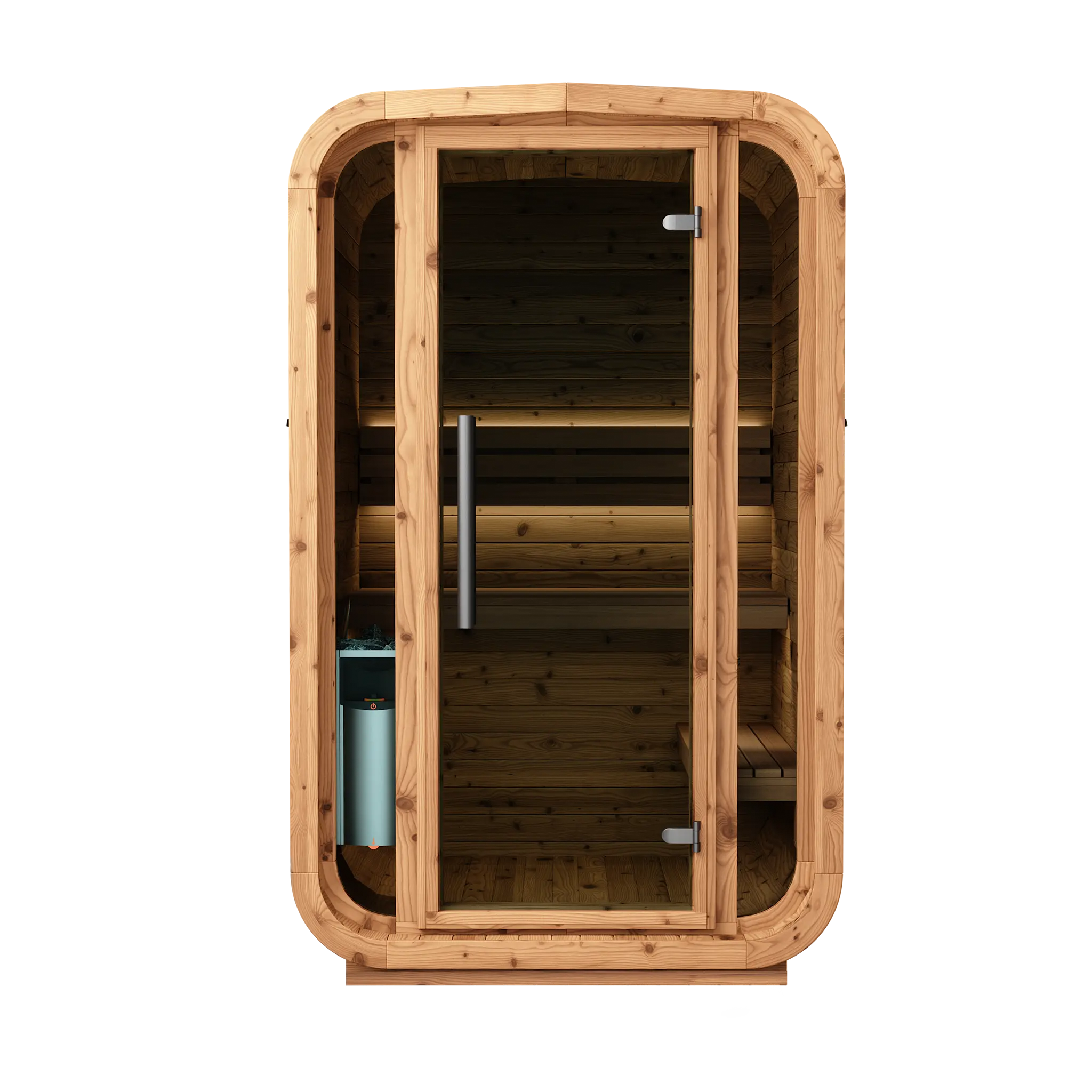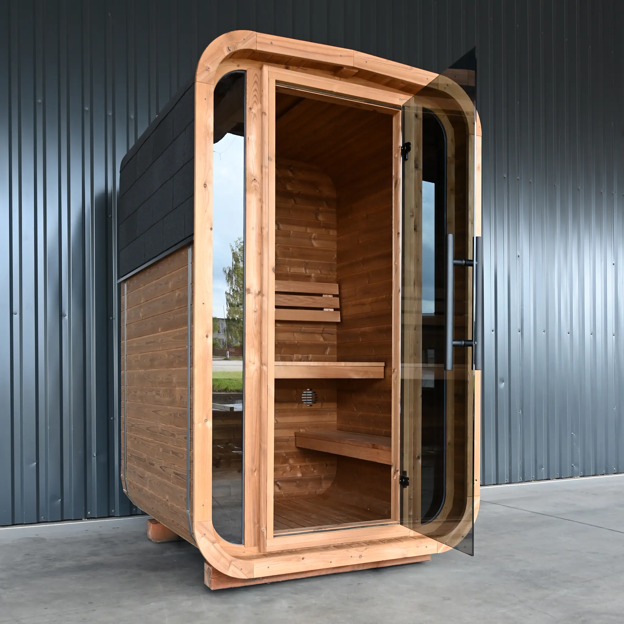 Trotz ihrer kompakten Abmessungen entsteht ein vollwertiger Saunaraum mit angenehmem Raumgefühl. Die reduzierte Grundfläche macht dieses Modell ideal für kleine Gärten, urbane Außenbereiche oder Projekte mit begrenztem Platzangebot.