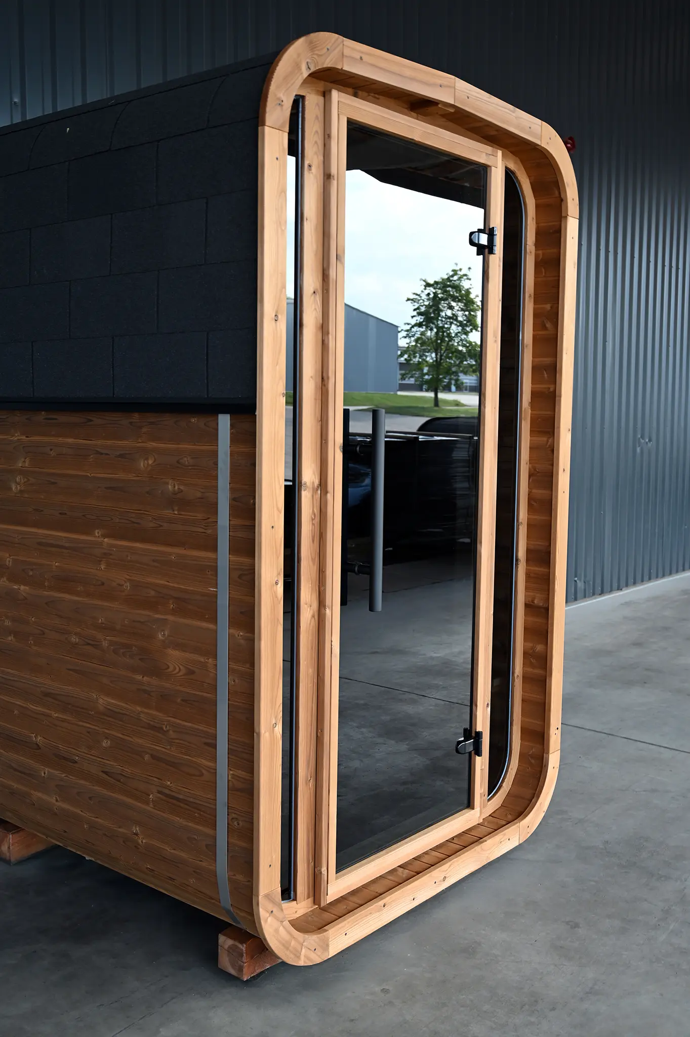 Die Quadro Gartensauna mit seitlichem Eingang bietet besonders viel Platz und einen großzügigen Vorraum. Der seitliche Zugang ermöglicht eine flexible Aufstellung und ist ideal für größere Gärten und komfortorientierte Saunanutzer.