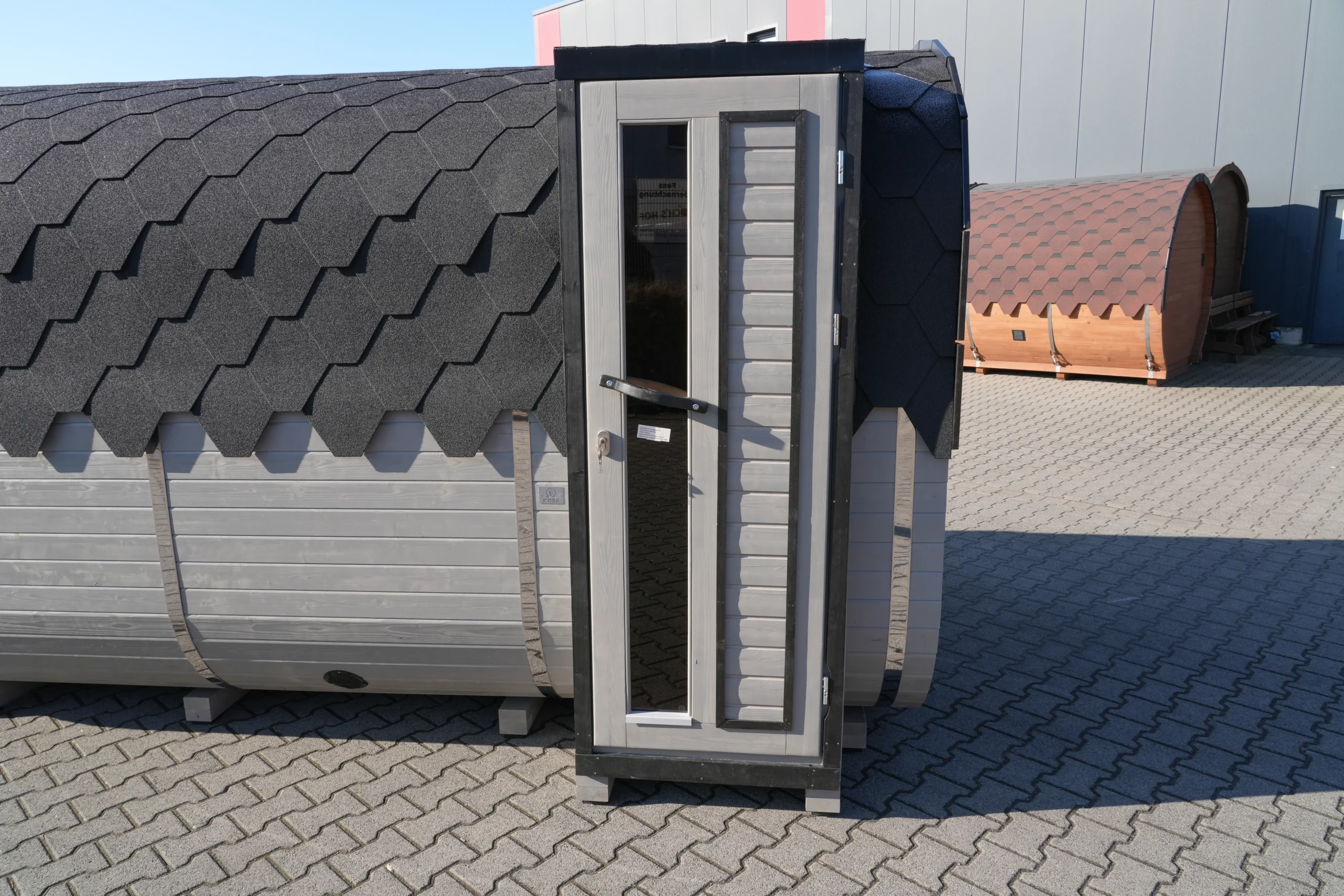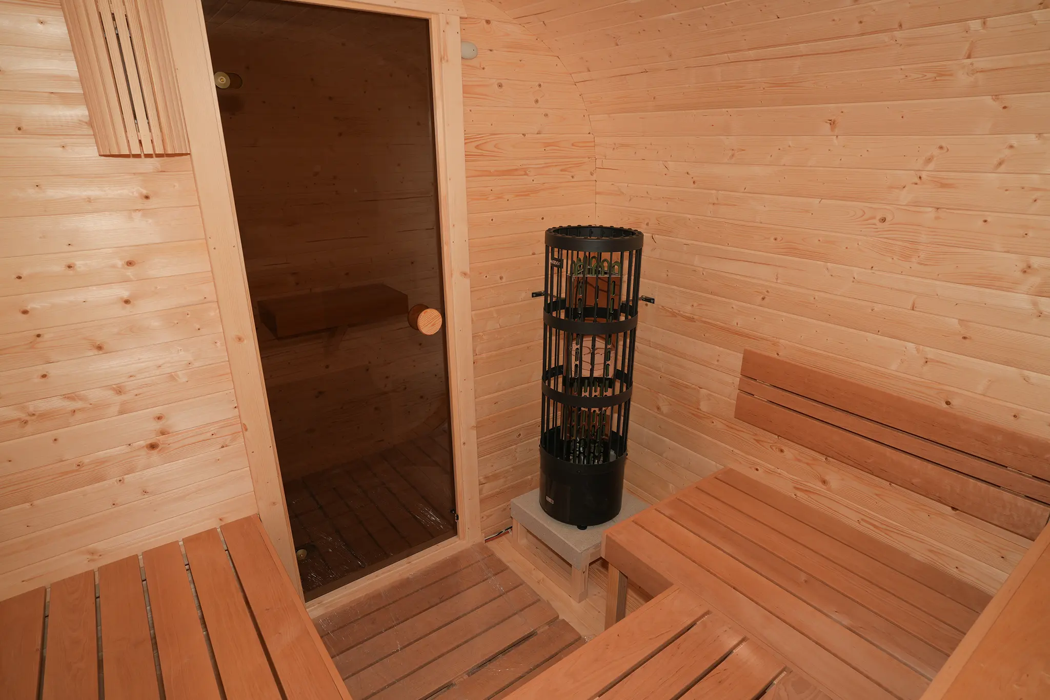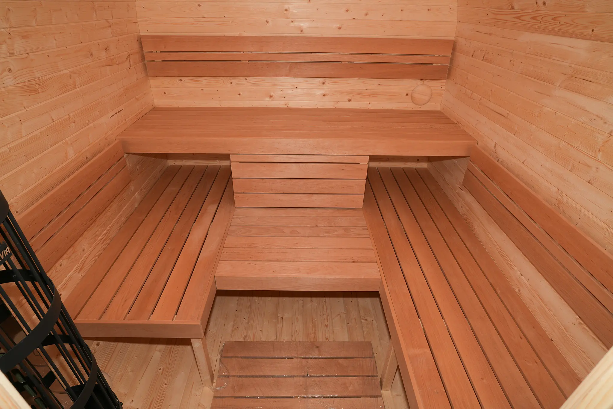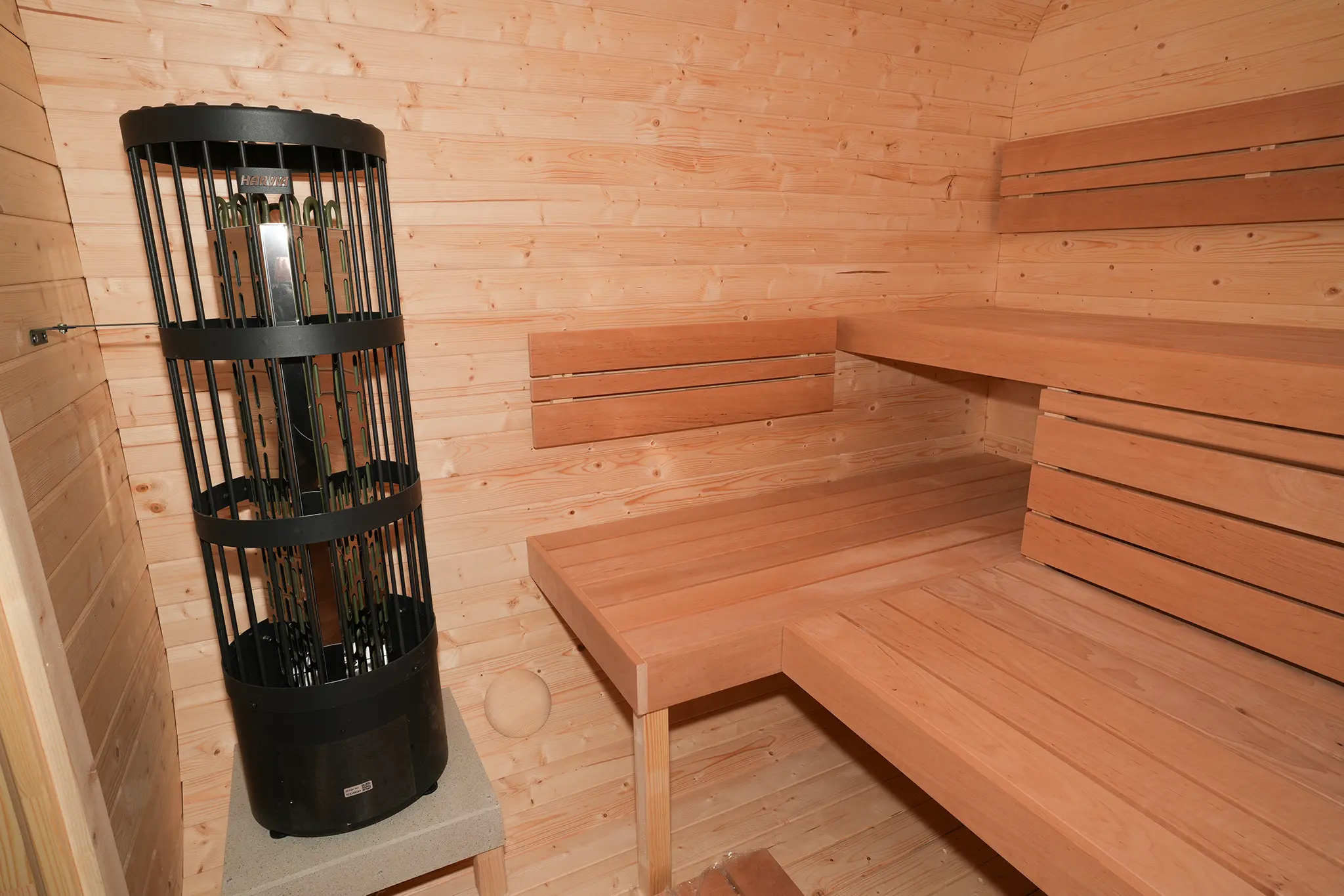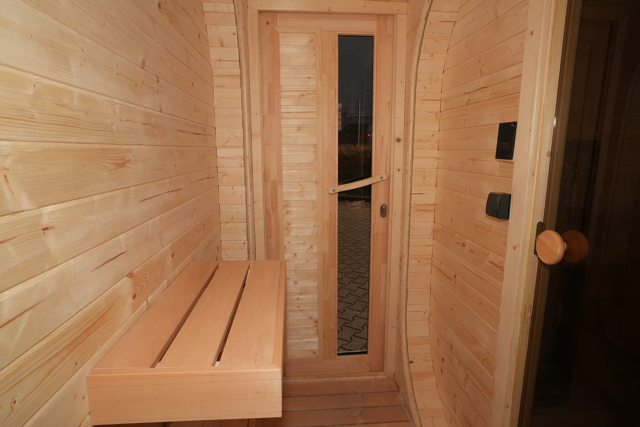 Großzügiger Vorraum und durchdachte AusstattungDer seitliche Eingang ermöglicht einen klar getrennten Saunaraum und Vorraum mit besonders komfortablen Abmessungen. Dadurch bleibt die Wärme im Saunaraum konstant, während der Vorraum als funktionaler Übergangsbereich genutzt werden kann.