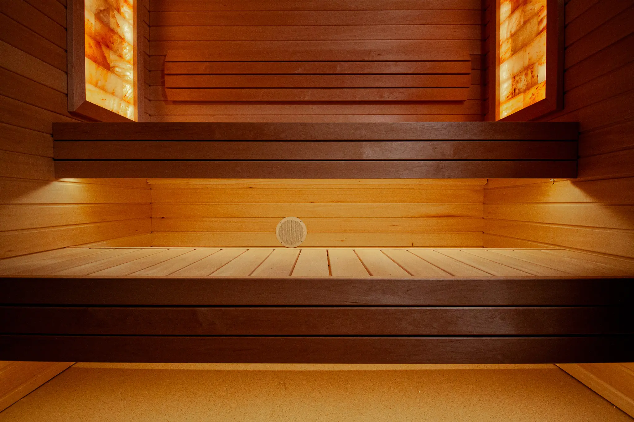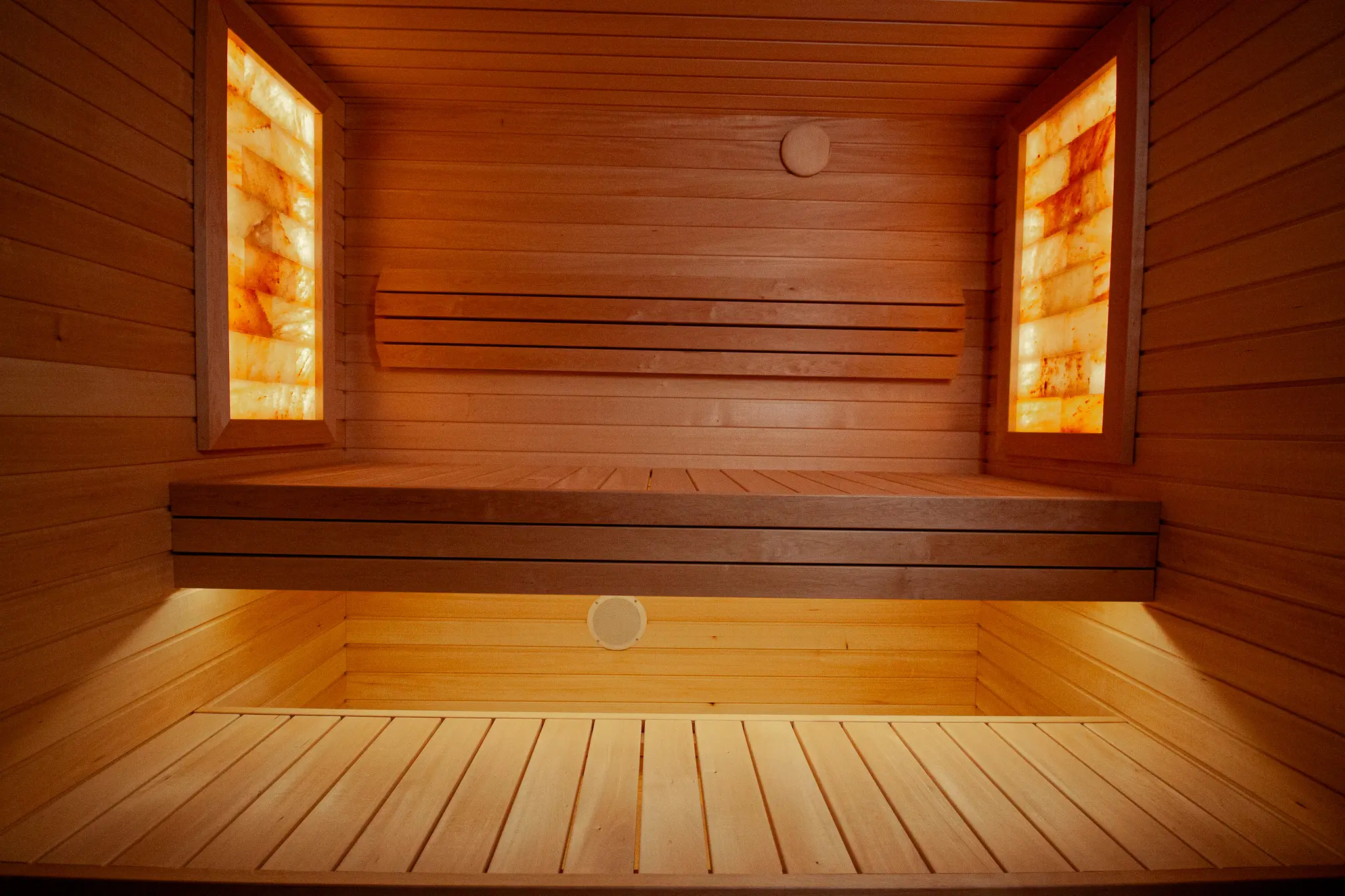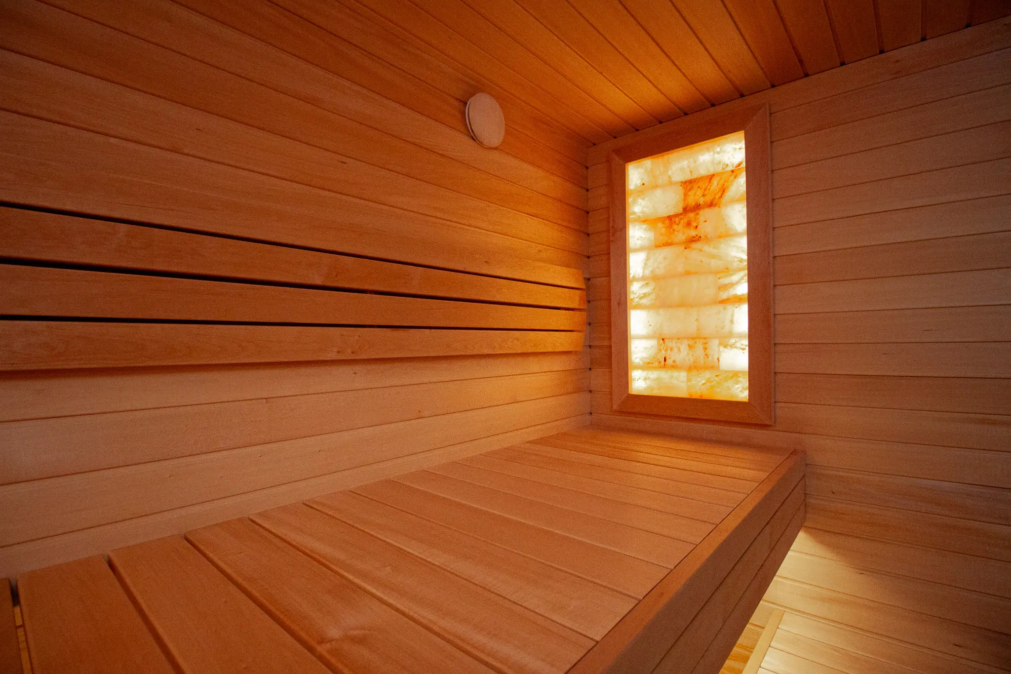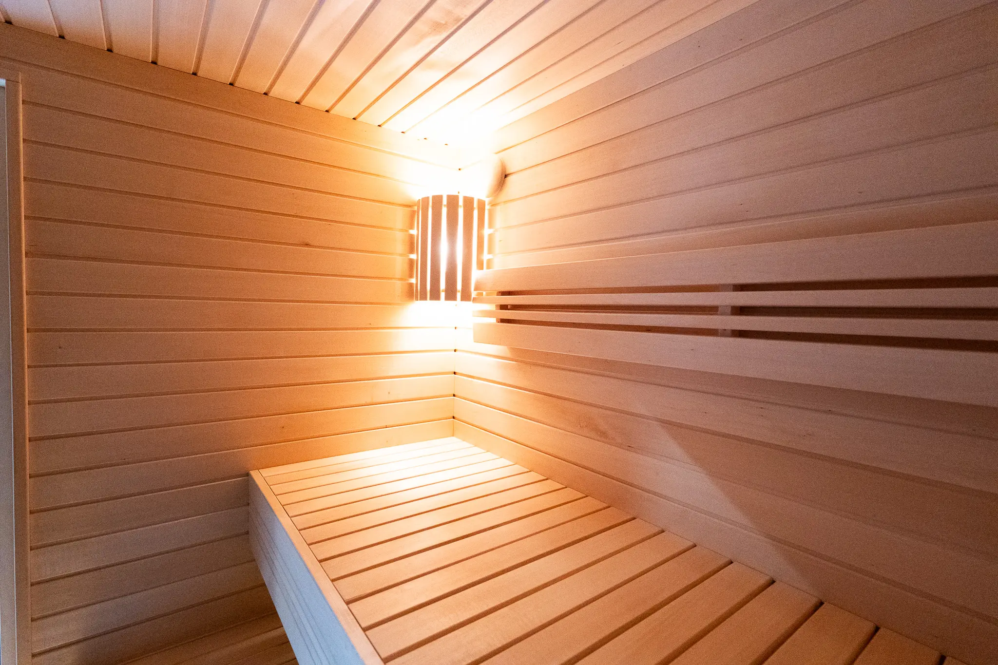 Die Beleuchtung im Saunaraum ist serienmäßig integriert. Rückenlehnen und Bodenrost gehören ebenfalls zur Grundausstattung und sorgen für komfortables Saunieren.