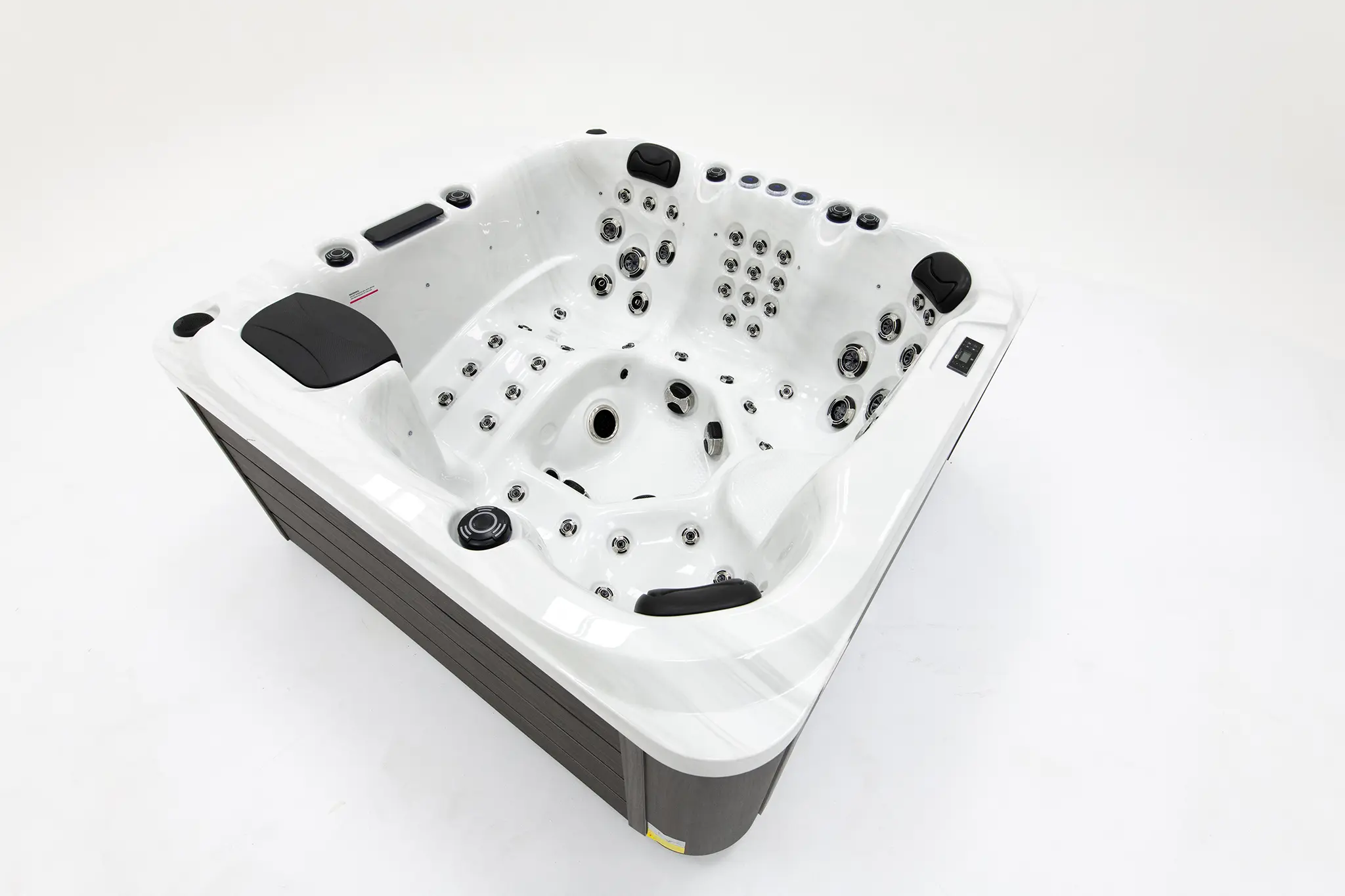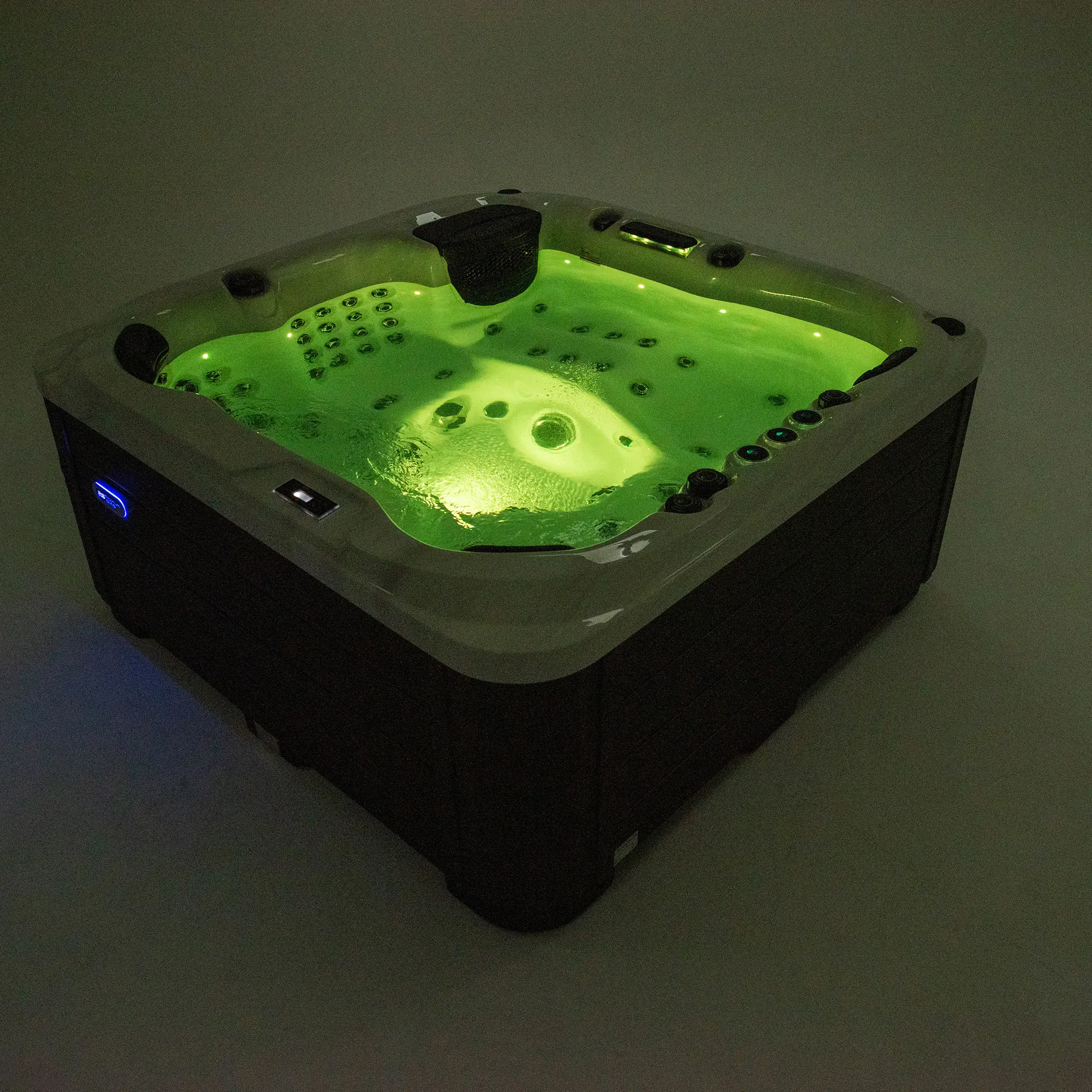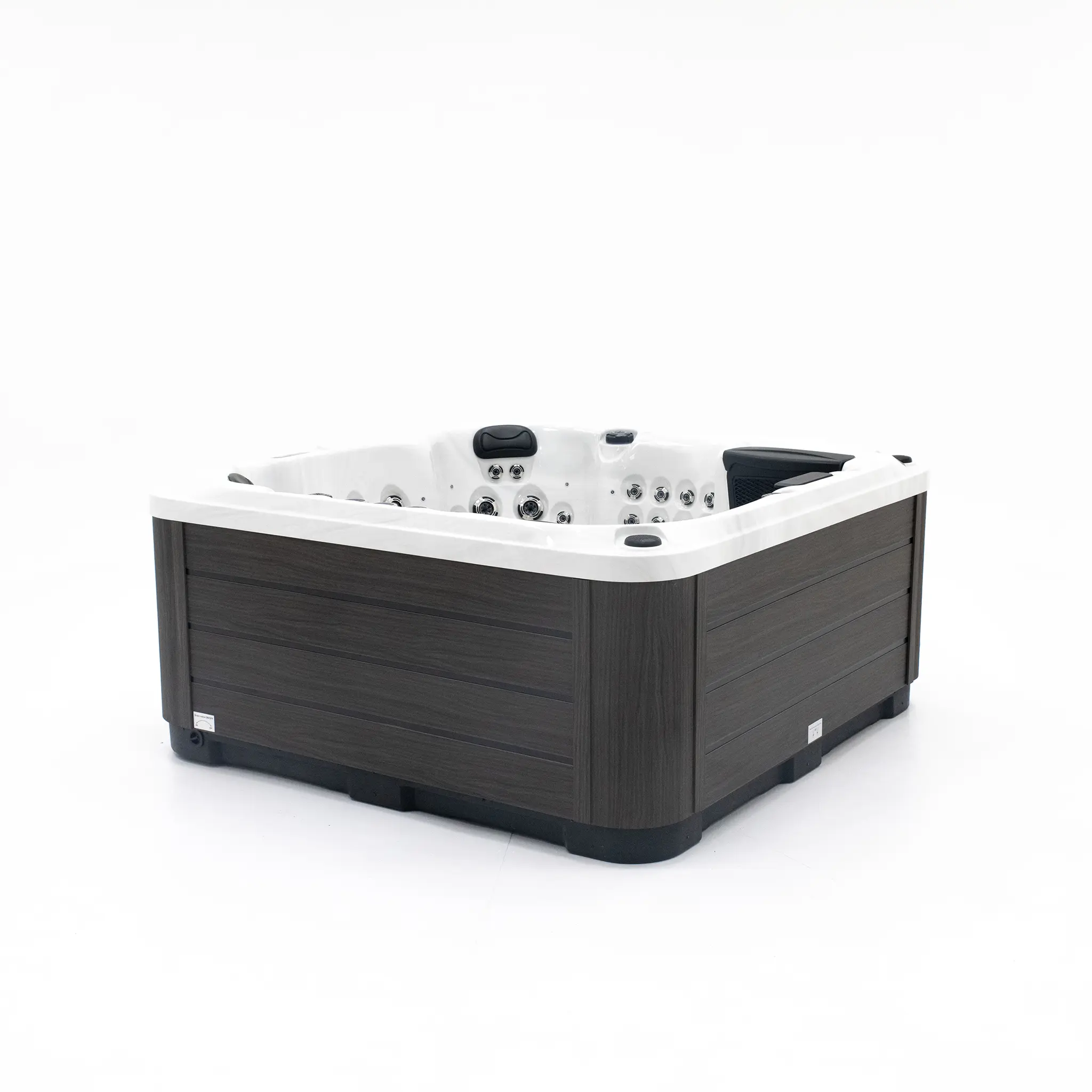 Die quadratische Bauform mit 200 × 200 × 90 cm sorgt für eine harmonische Integration in unterschiedlichste Außenbereiche. Das hochwertige Acrylbecken ist langlebig und pflegeleicht. Die Außenverkleidung aus grauem WPC verleiht dem Whirlpool eine moderne, zeitlose Optik und hohe Witterungsbeständigkeit. Die Wannenfarbe ist in mehreren eleganten Varianten erhältlich.