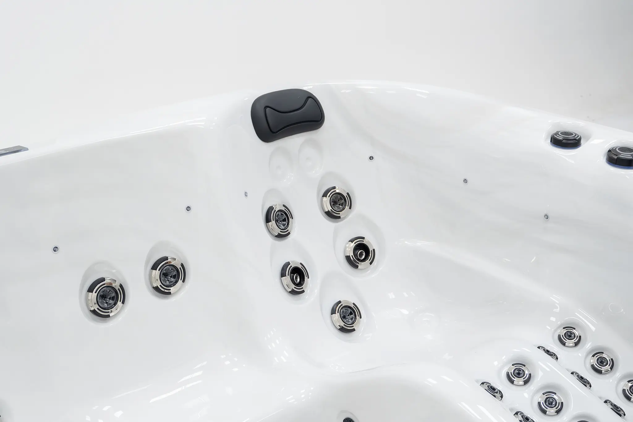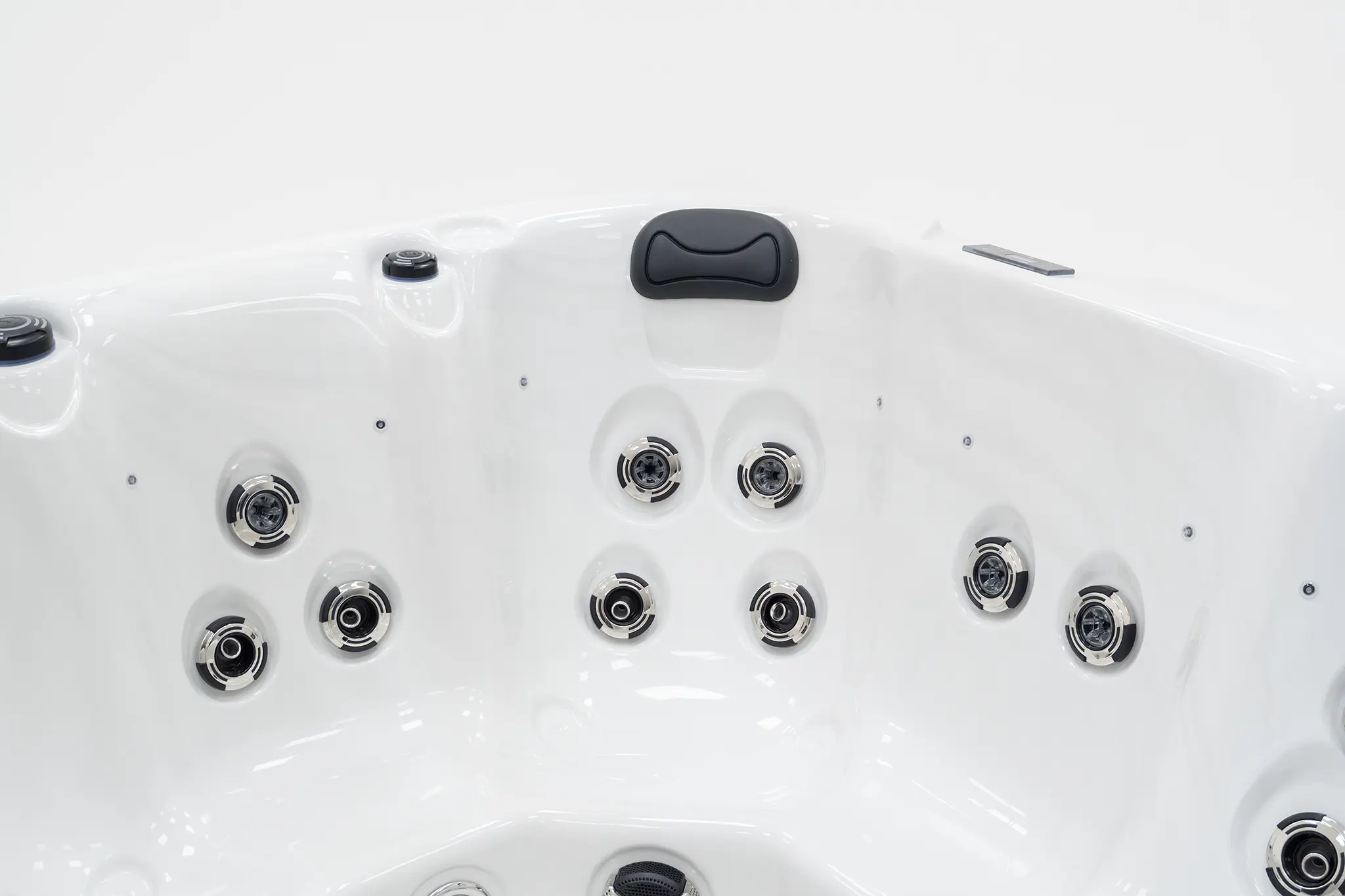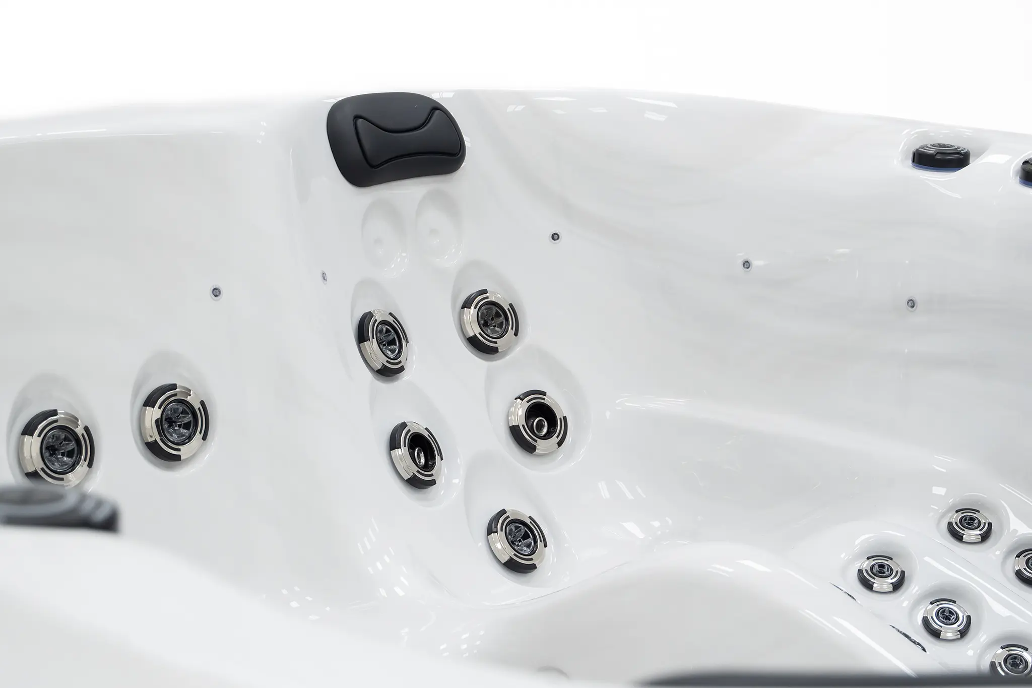Für die Massageleistung sorgen 49 präzise angeordnete Düsen, unterstützt durch zwei leistungsstarke 2-HP-Massagepumpen sowie eine separate Umwälzpumpe. Die integrierte 3-kW-Heizung gewährleistet eine schnelle und konstante Temperaturregelung. Der Betrieb ist flexibel mit 230 V oder 400 V möglich und bietet damit vielseitige Installationsoptionen.