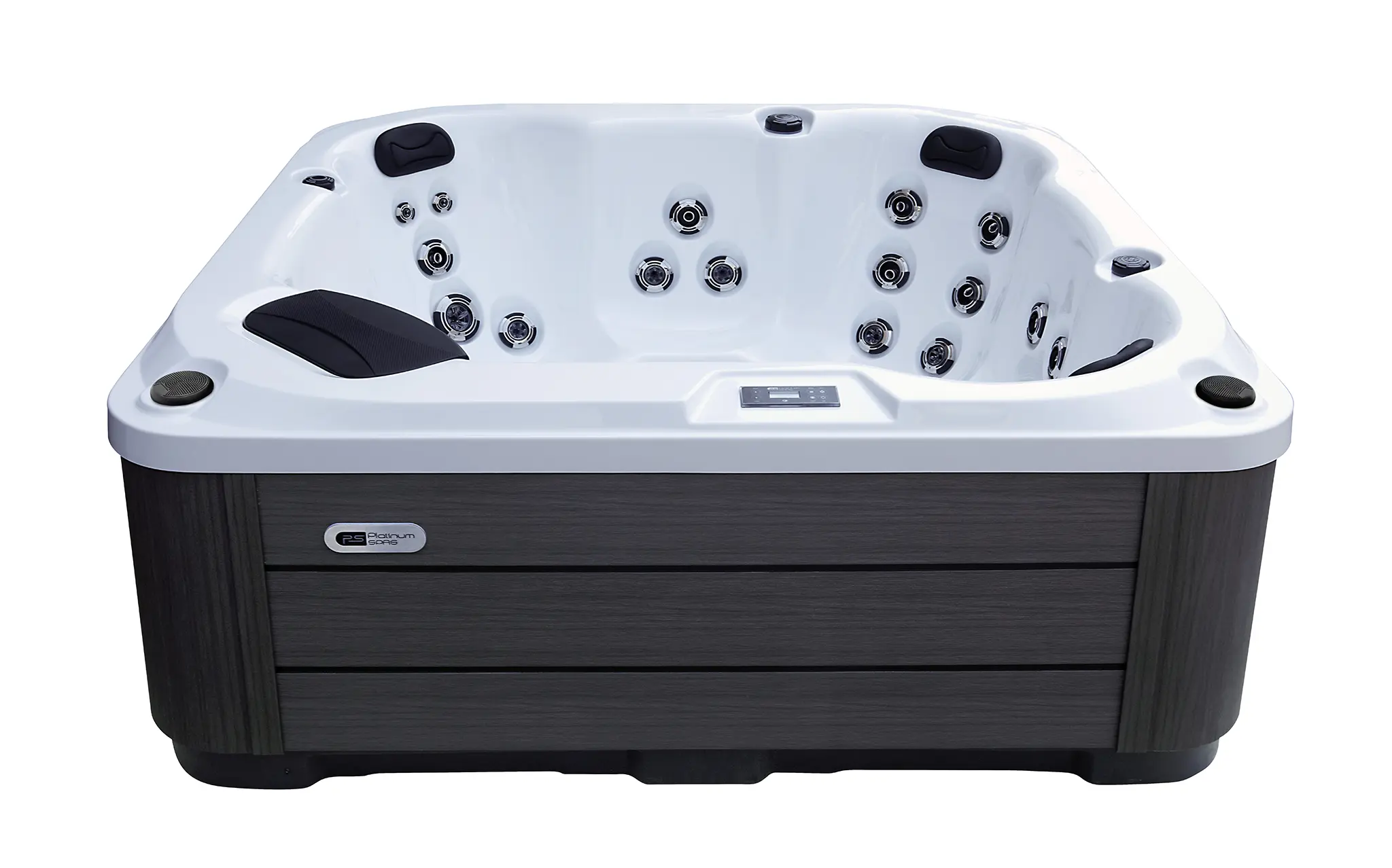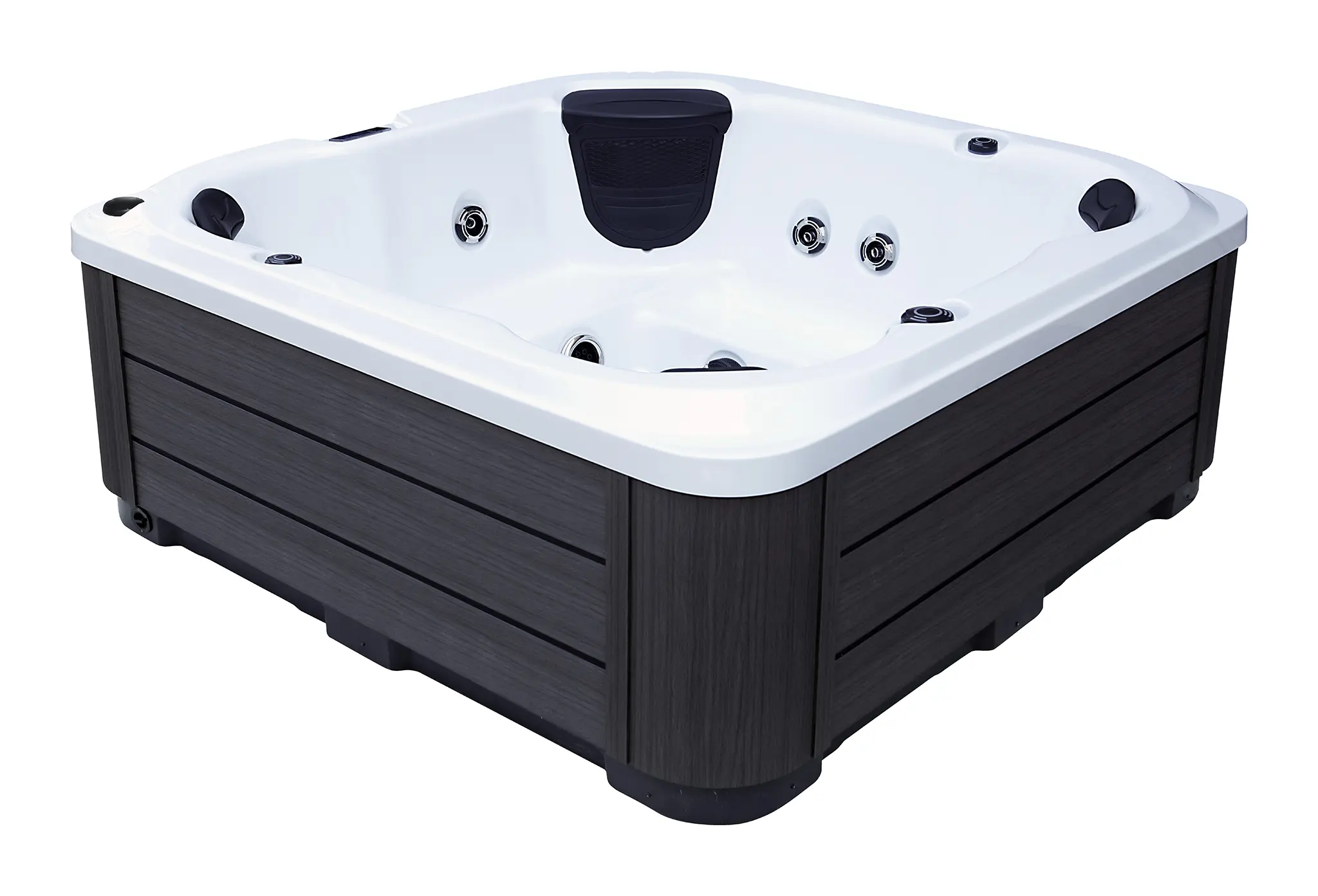 Die quadratische Bauform mit 200 × 200 cm ermöglicht eine platzsparende Integration auf Terrasse oder im Garten, ohne dabei auf Komfort zu verzichten. Das hochwertige Acrylbecken in der Wannenfarbe „Reines Weiß“ ist langlebig, pflegeleicht und widerstandsfähig gegenüber Witterungseinflüssen. Die Außenverkleidung aus grauem WPC sorgt für eine moderne Optik und hohe Stabilität.