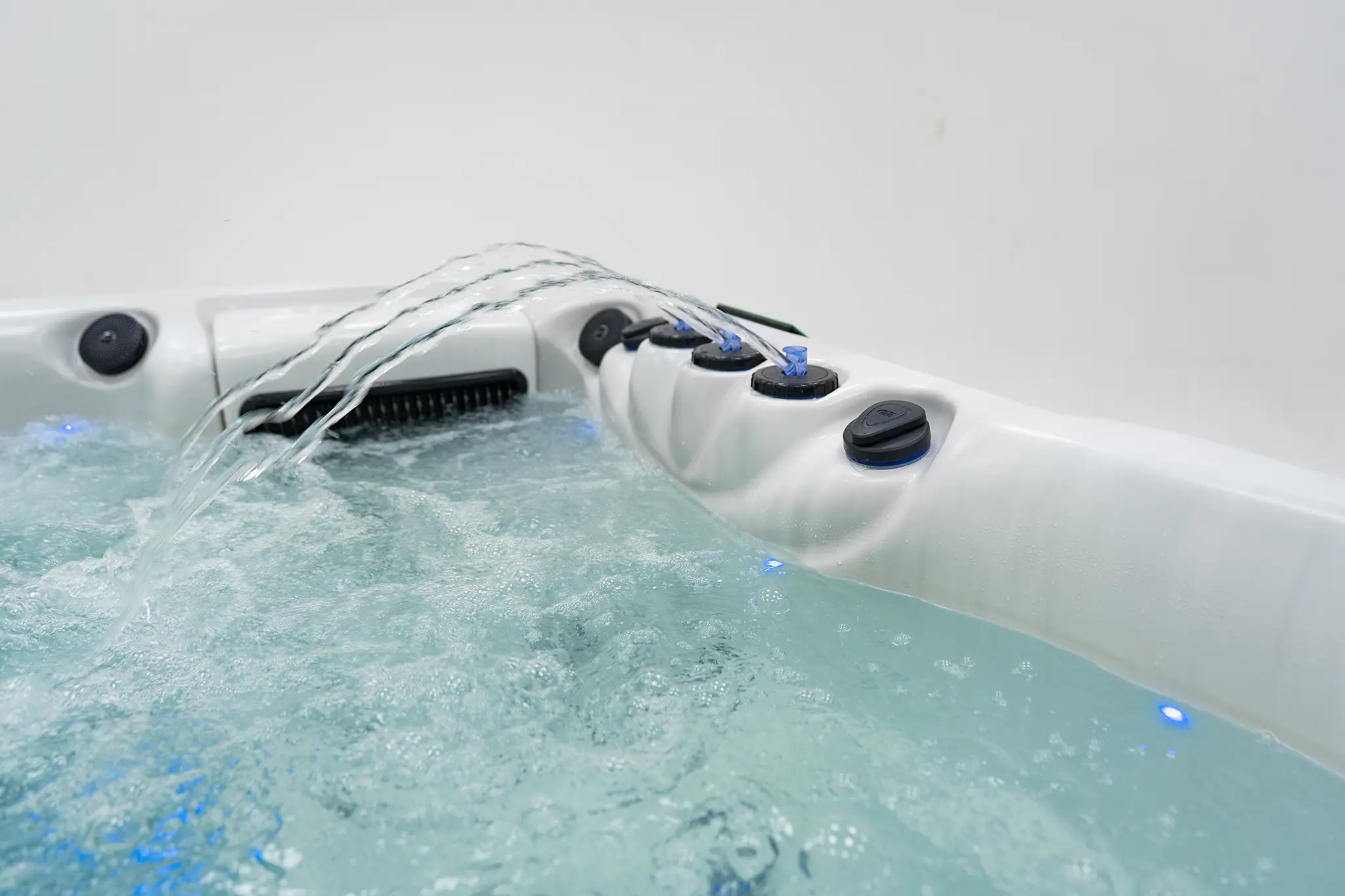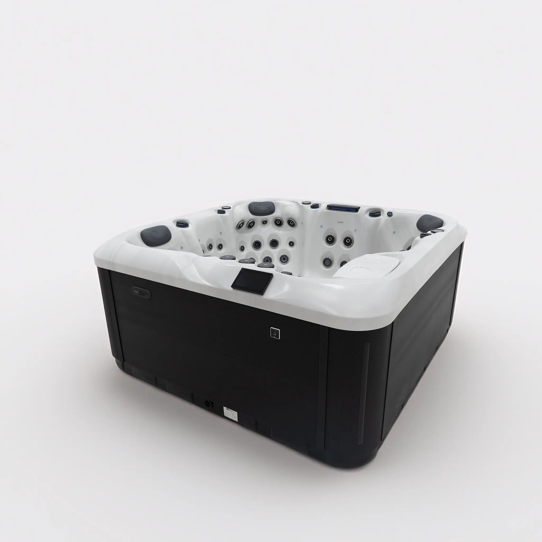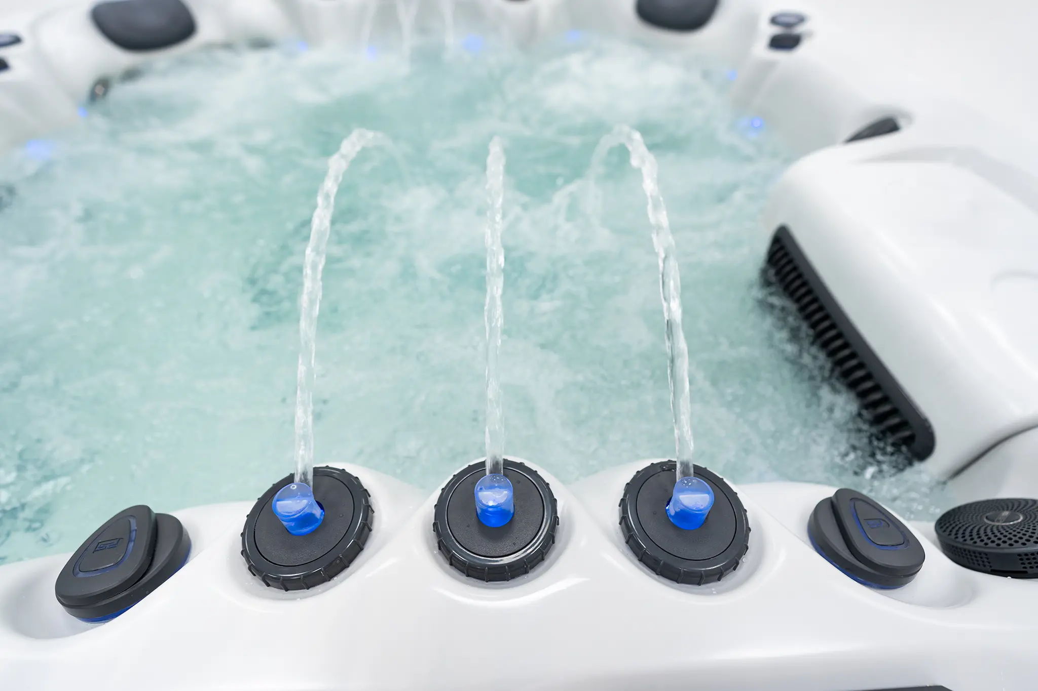 Für die intensive Hydromassage sorgen 67 präzise angeordnete Düsen, unterstützt durch zwei leistungsstarke 3-HP-Massagepumpen sowie eine separate Umwälzpumpe. Die integrierte 3-kW-Heizung gewährleistet eine schnelle und konstante Temperaturregelung. Der Anschluss kann flexibel über 230 V oder 400 V erfolgen.