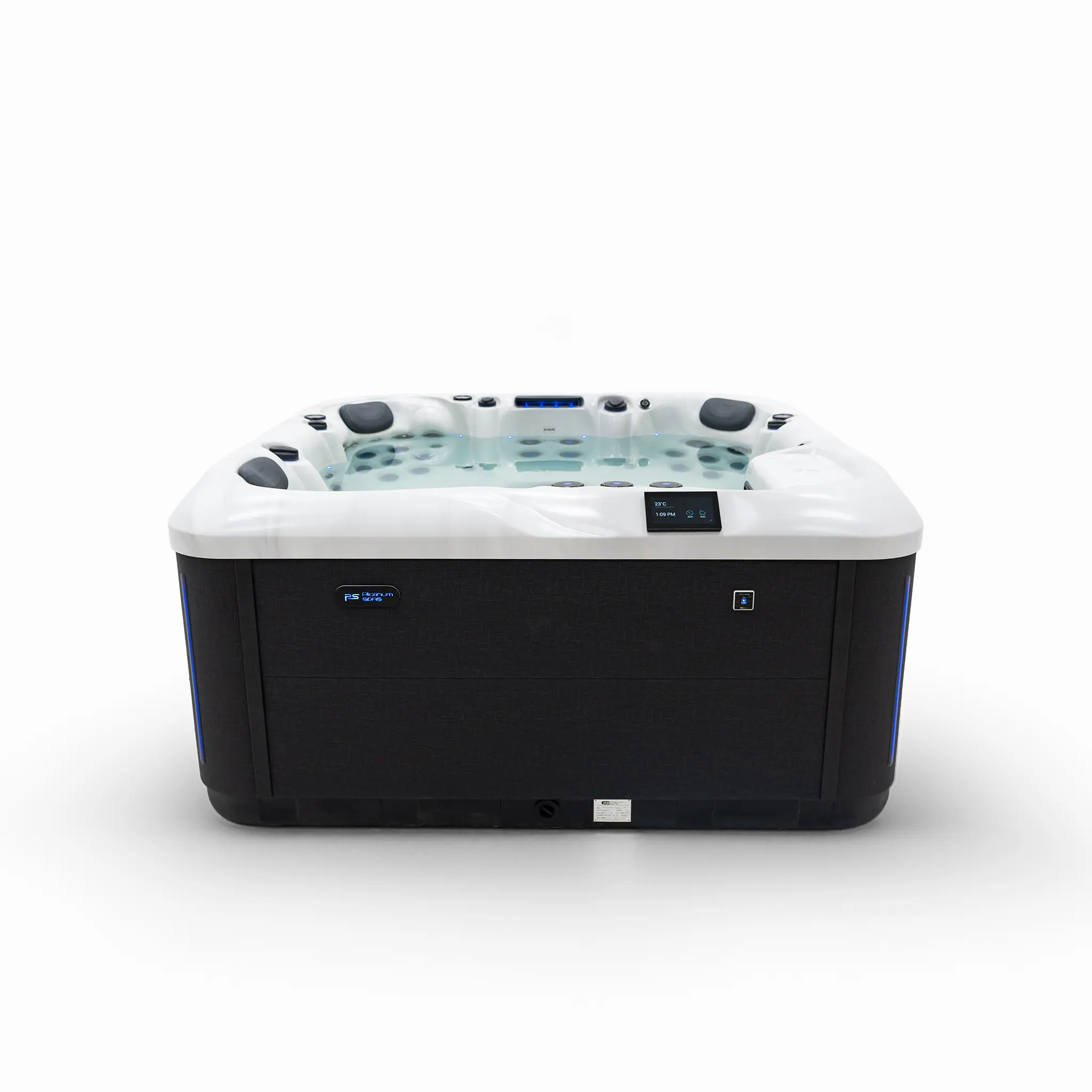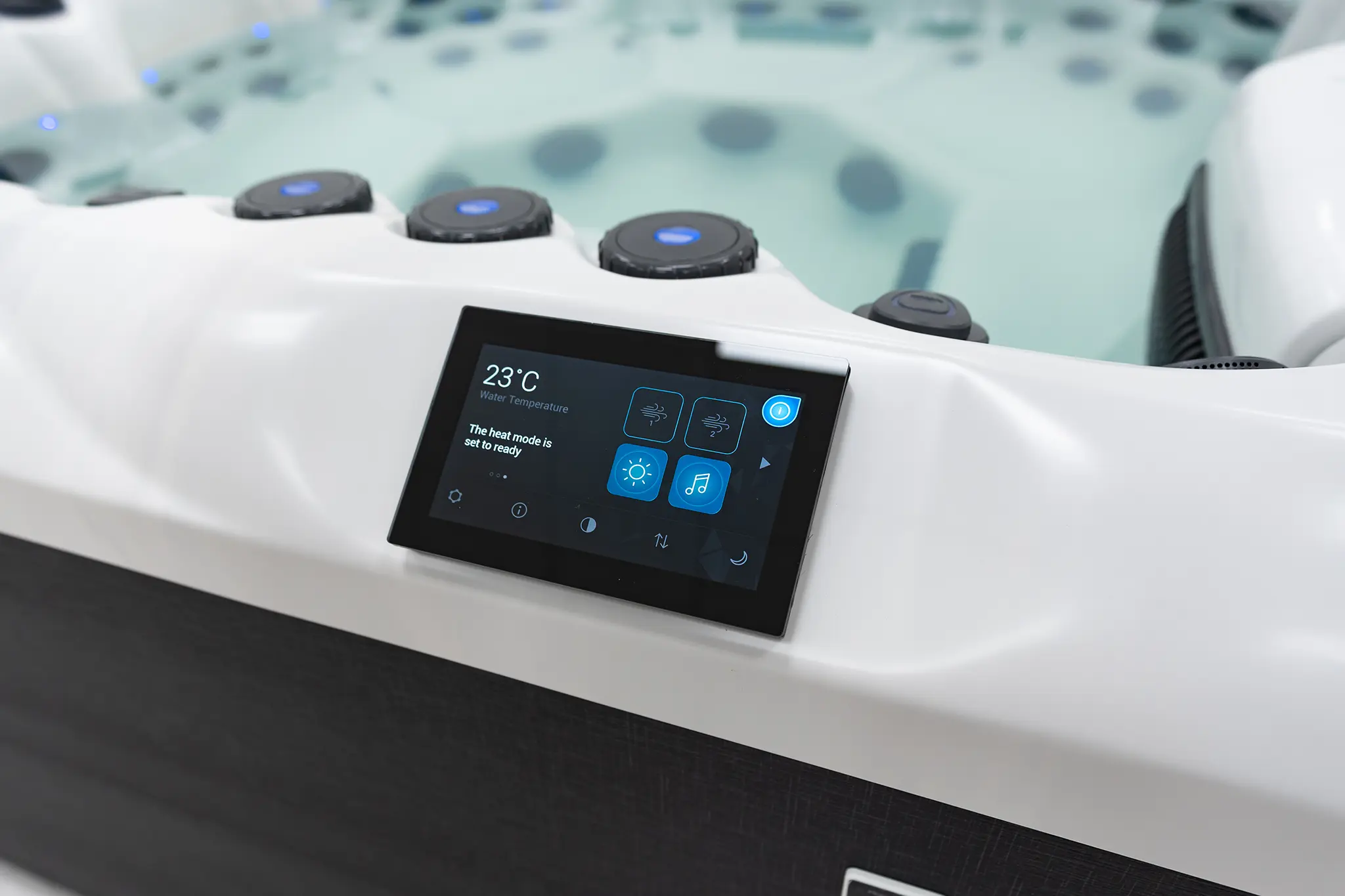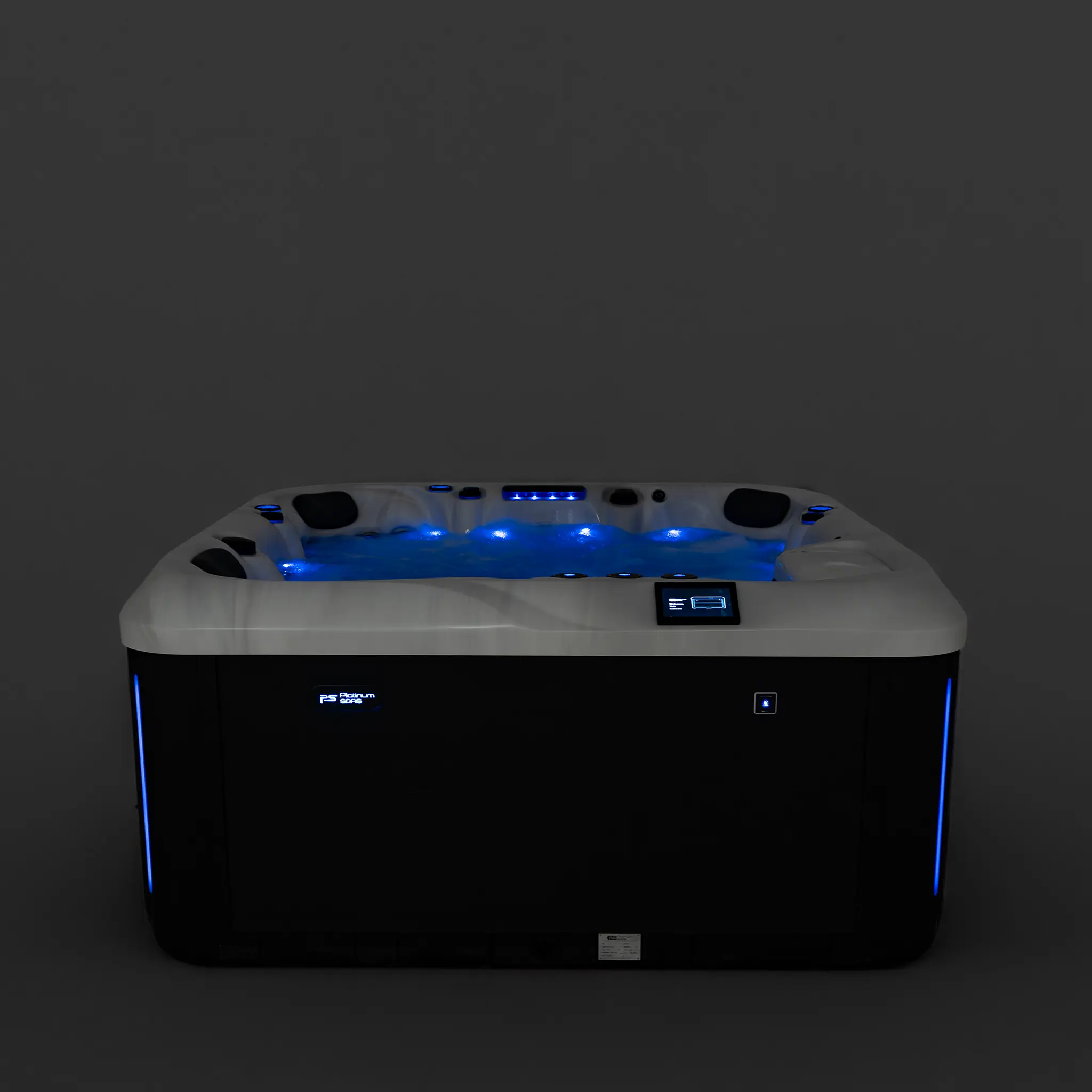 Für die intensive Hydromassage sorgen 67 präzise angeordnete Düsen, unterstützt durch zwei leistungsstarke 3-HP-Massagepumpen sowie eine separate Umwälzpumpe. Die integrierte 3-kW-Heizung gewährleistet eine schnelle und konstante Temperaturregelung. Der Anschluss kann flexibel über 230 V oder 400 V erfolgen.