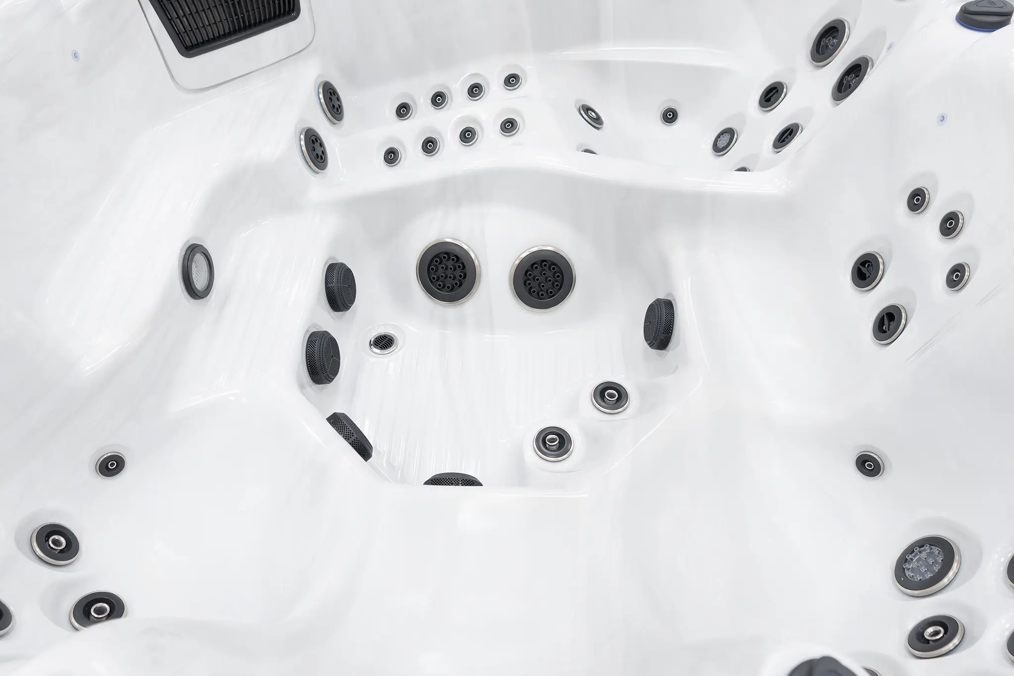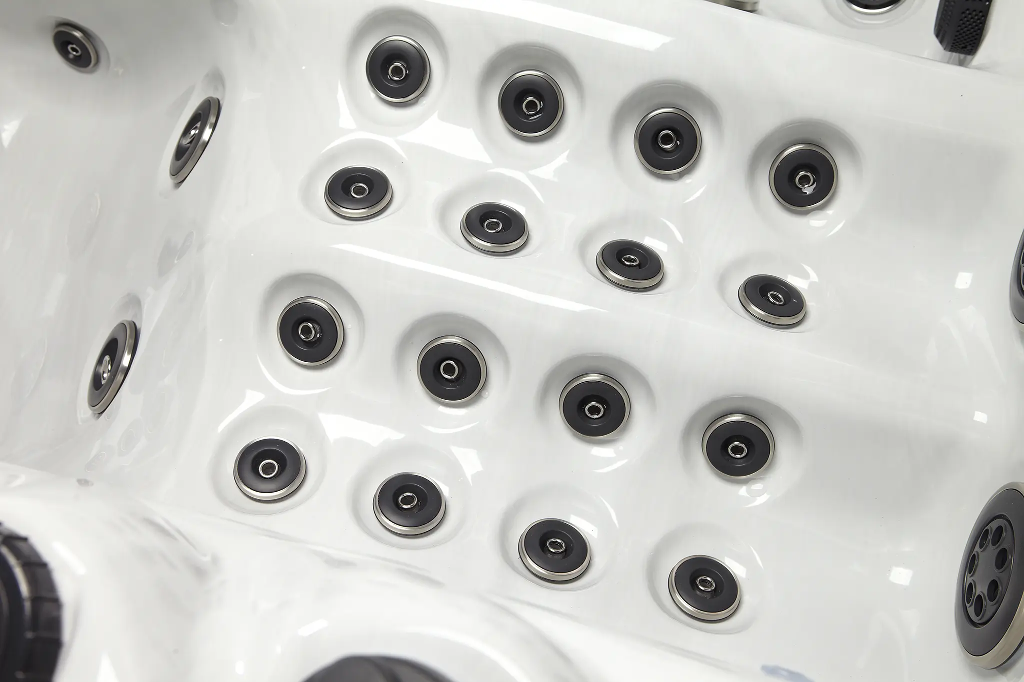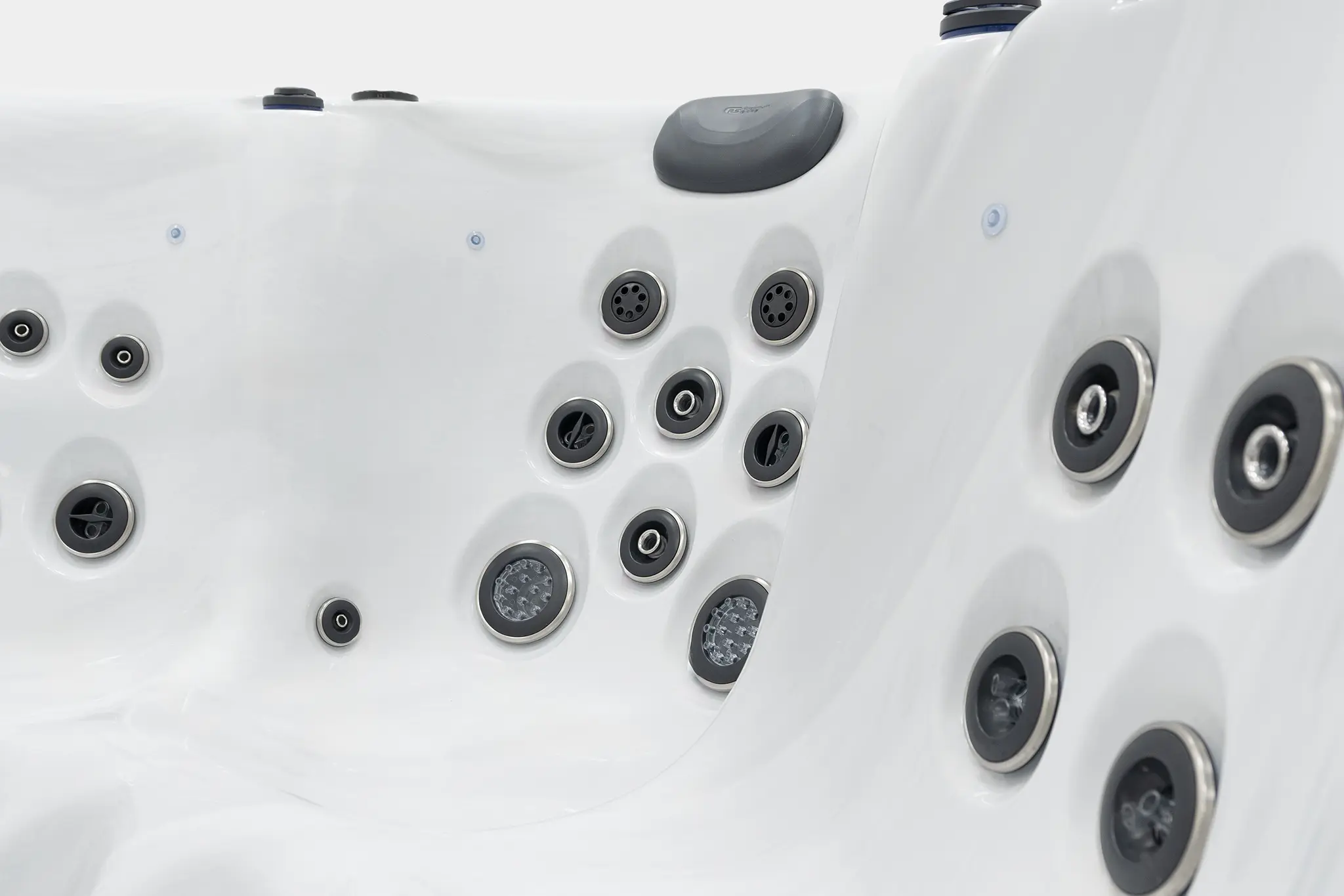 Für die intensive Hydromassage sorgen 66 präzise angeordnete Düsen, unterstützt durch drei leistungsstarke 3-HP-Massagepumpen sowie eine separate Umwälzpumpe. Diese Kombination ermöglicht eine besonders kraftvolle und gleichmäßige Wasserbewegung. Die integrierte 3-kW-Heizung gewährleistet eine konstante Temperaturregelung. Der Anschluss kann flexibel über 230 V oder 400 V erfolgen.