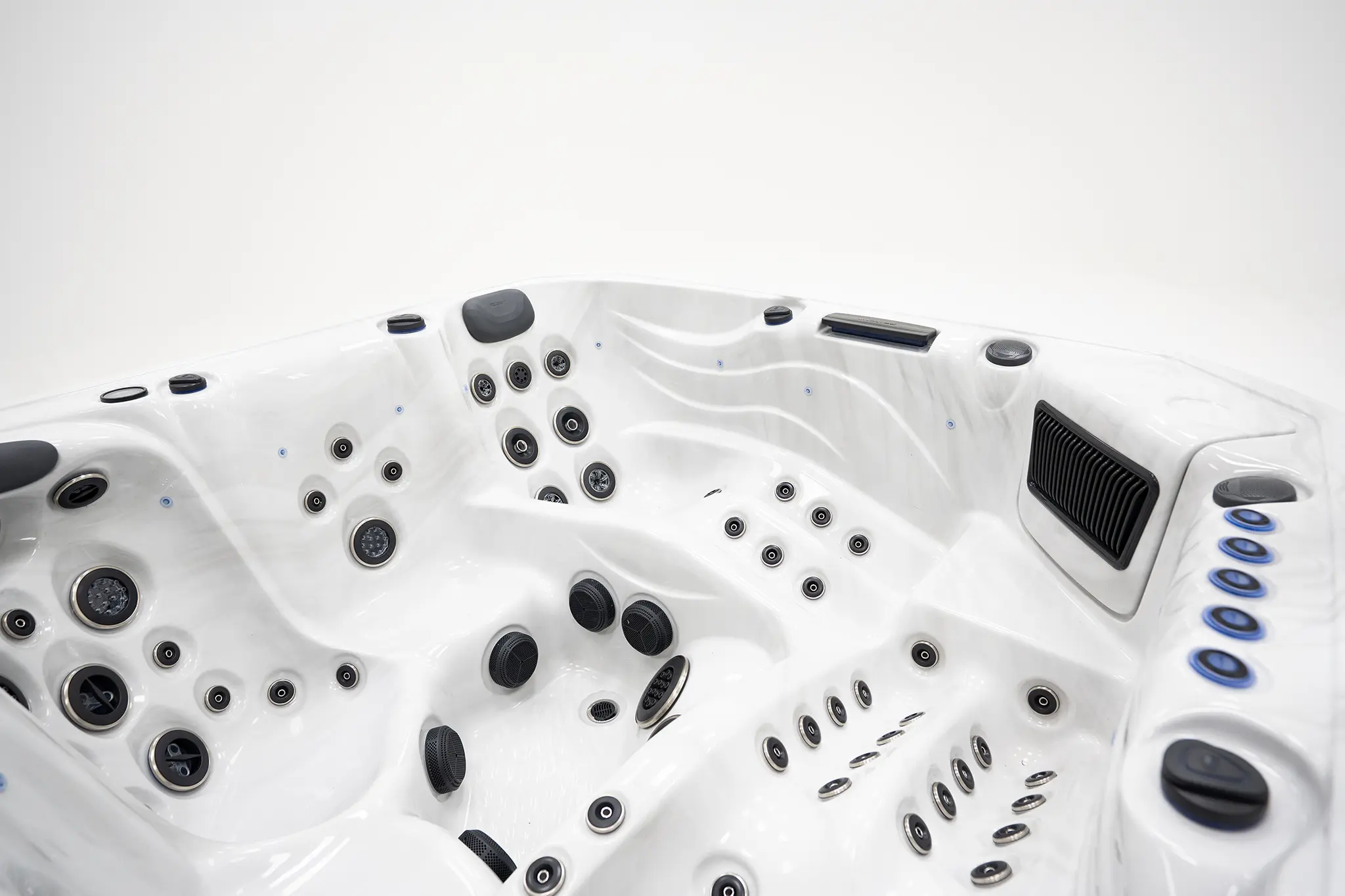 Der Onyx Whirlpool aus der Premium Range bietet intensive Hydromassage und großzügigen Liegekomfort für bis zu fünf Personen. Mit 90 Massagedüsen, vier Massagepumpen und zwei Liegeflächen ist dieses Modell auf maximale Entspannung im Außenbereich ausgelegt.