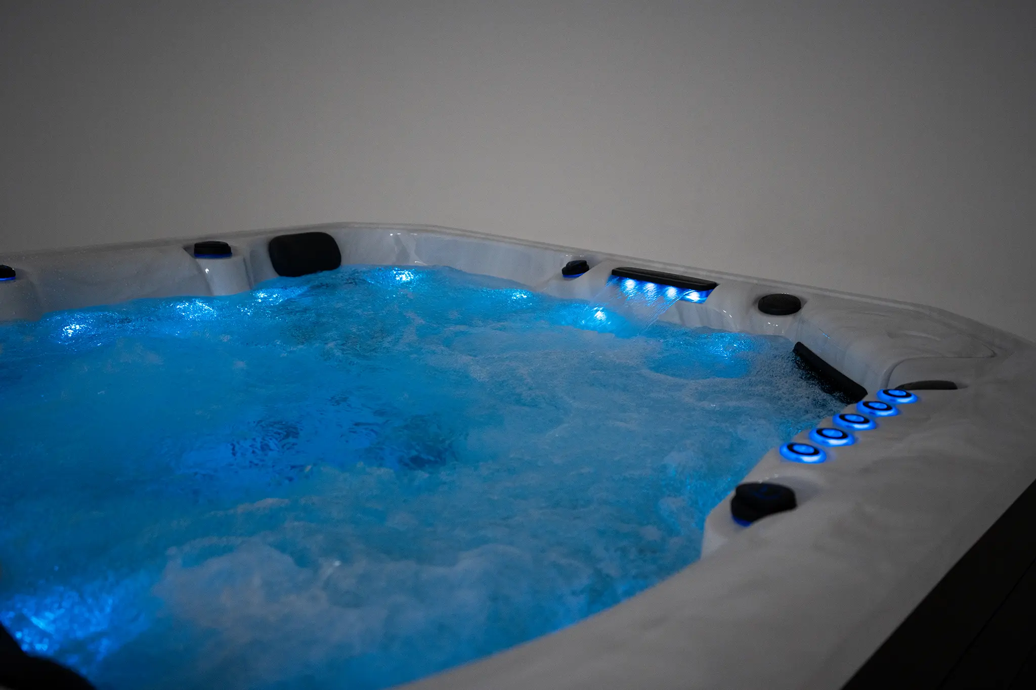 Insgesamt 86 präzise angeordnete Massagedüsen sorgen für eine intensive Hydromassage. Drei leistungsstarke 3-HP-Pumpen gewährleisten eine gleichmäßige und kraftvolle Wasserzirkulation. Die integrierte 3-kW-Heizung ermöglicht eine konstante Temperaturregelung. Der Anschluss ist flexibel über 230 V oder 400 V (32 Ampere) möglich.