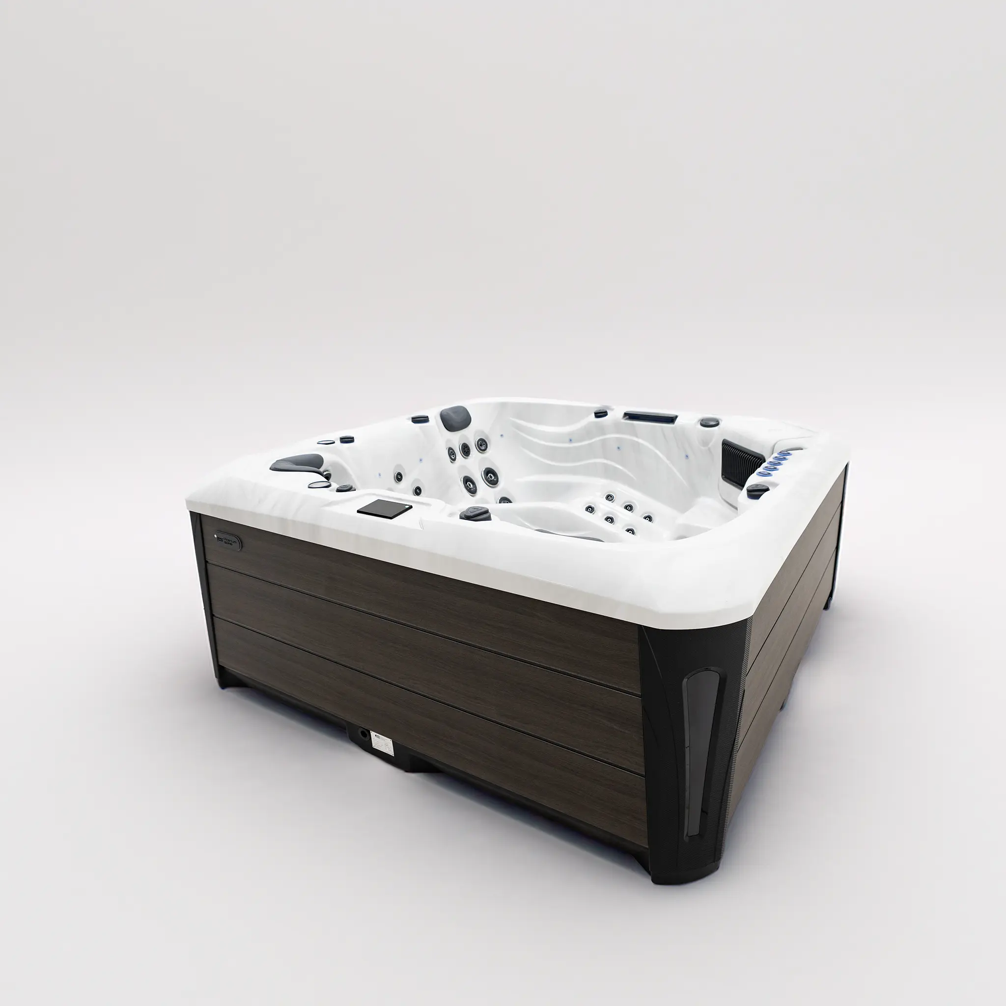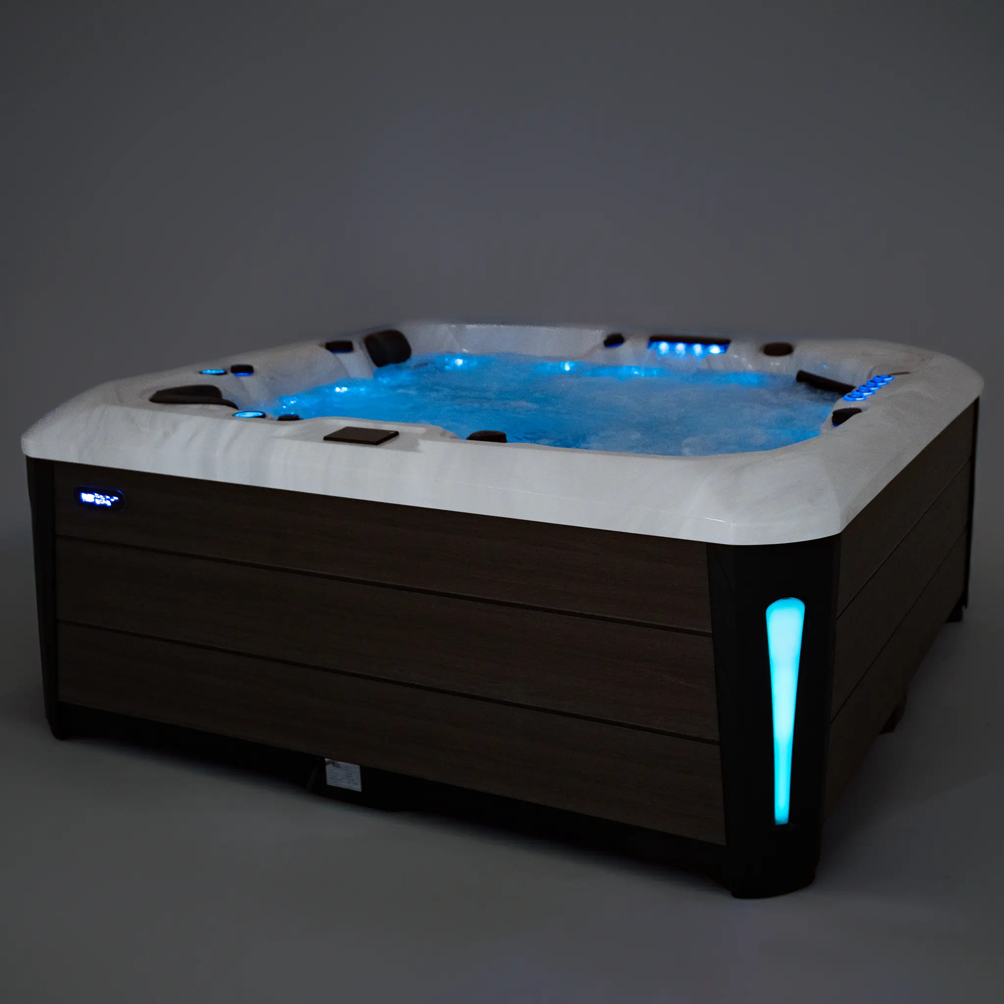 Mit seinen großzügigen Maßen von 223 × 223 × 94 cm bietet der Whirlpool viel Bewegungsfreiheit und eine offene, komfortable Sitzanordnung. Das langlebige Acrylbecken ist pflegeleicht und in mehreren eleganten Wannenfarben erhältlich. Die graue WPC-Außenverkleidung sorgt für eine moderne, witterungsbeständige Optik im Außenbereich.