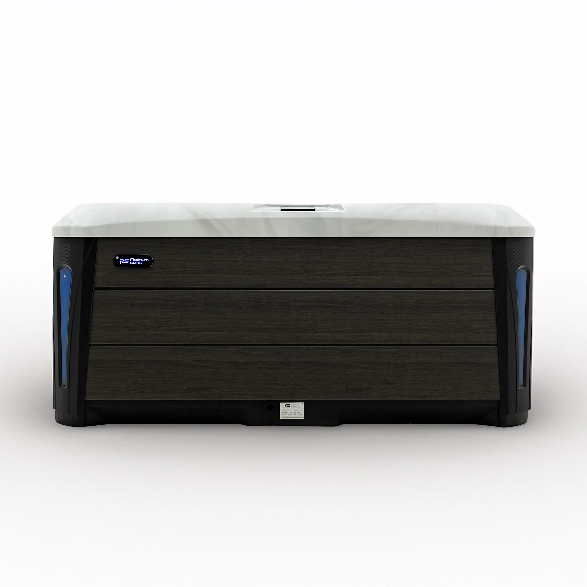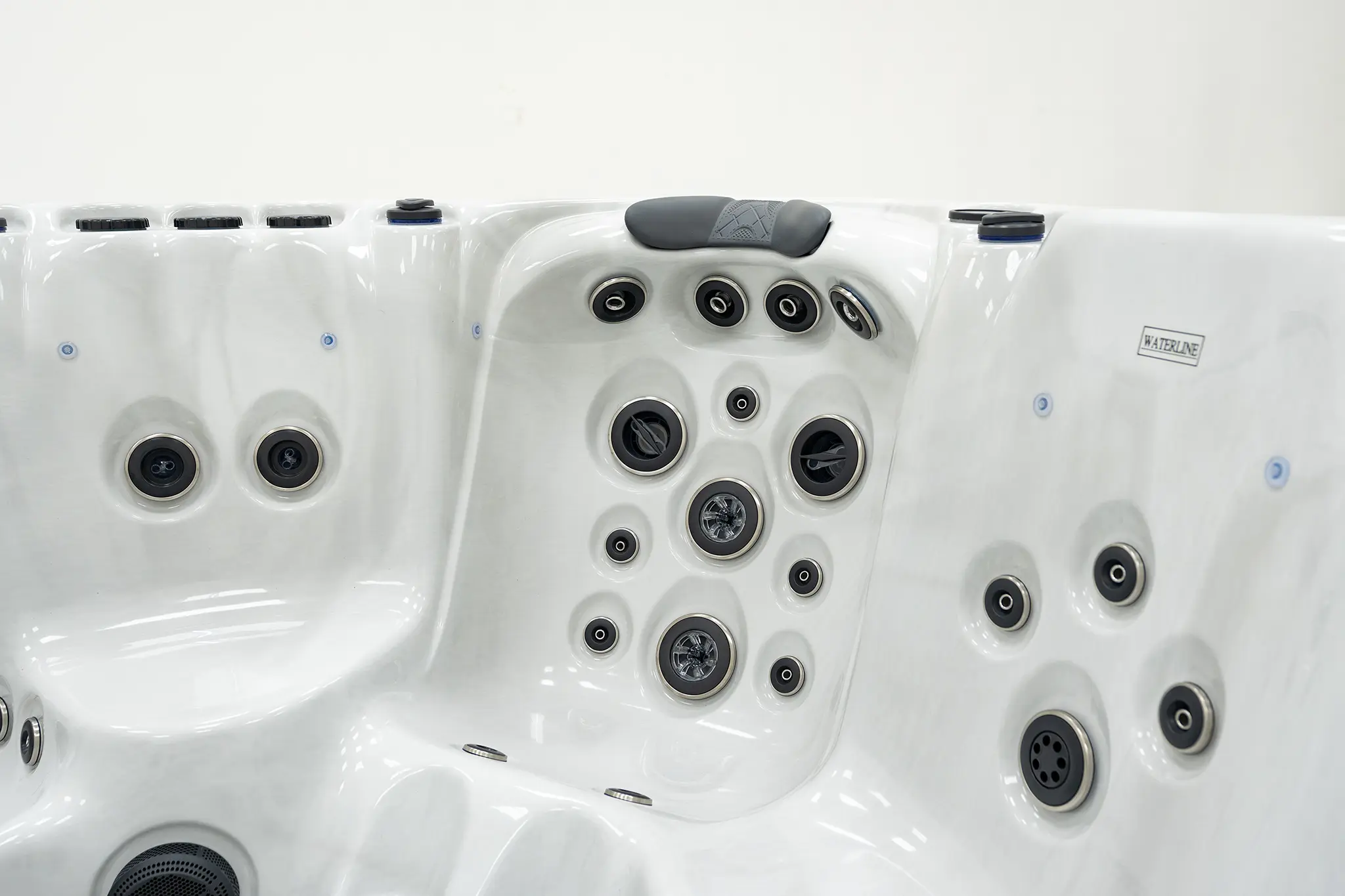 Für die Hydromassage sorgen 48 präzise angeordnete Düsen, unterstützt durch zwei leistungsstarke 2-HP-Massagepumpen sowie eine separate Umwälzpumpe. Die integrierte 3-kW-Heizung gewährleistet eine konstante Temperaturregelung. Der Anschluss kann flexibel über 230 V oder 400 V erfolgen.