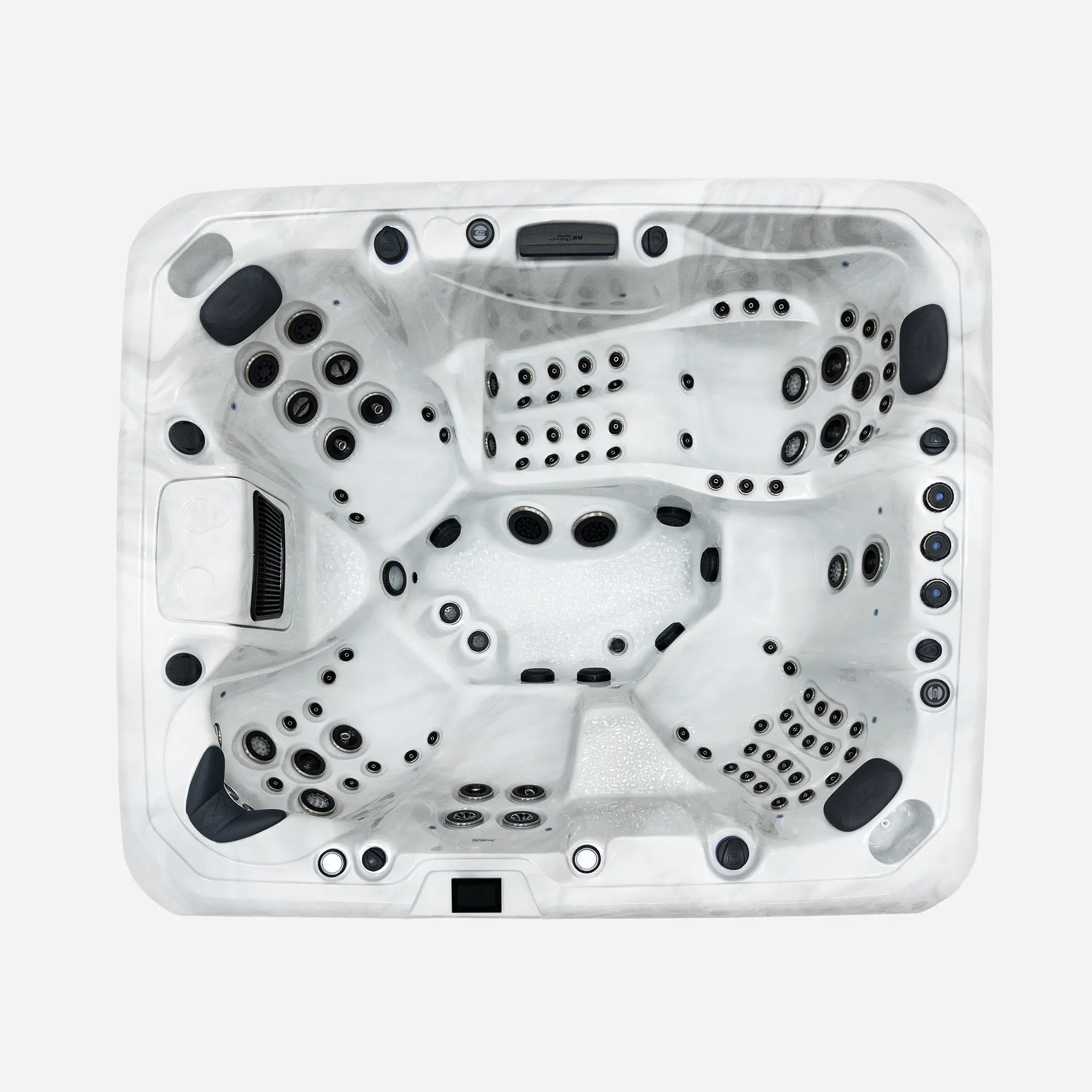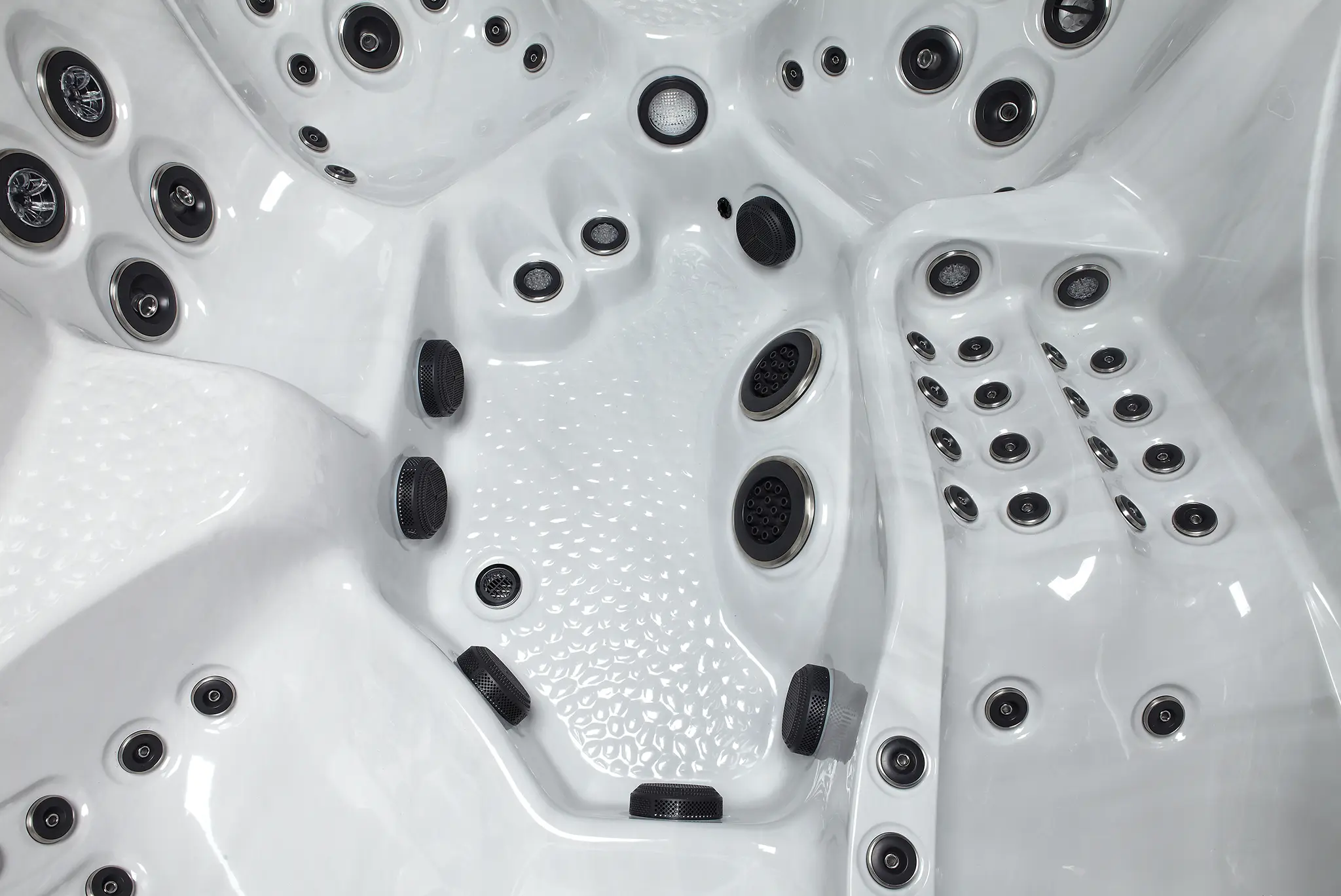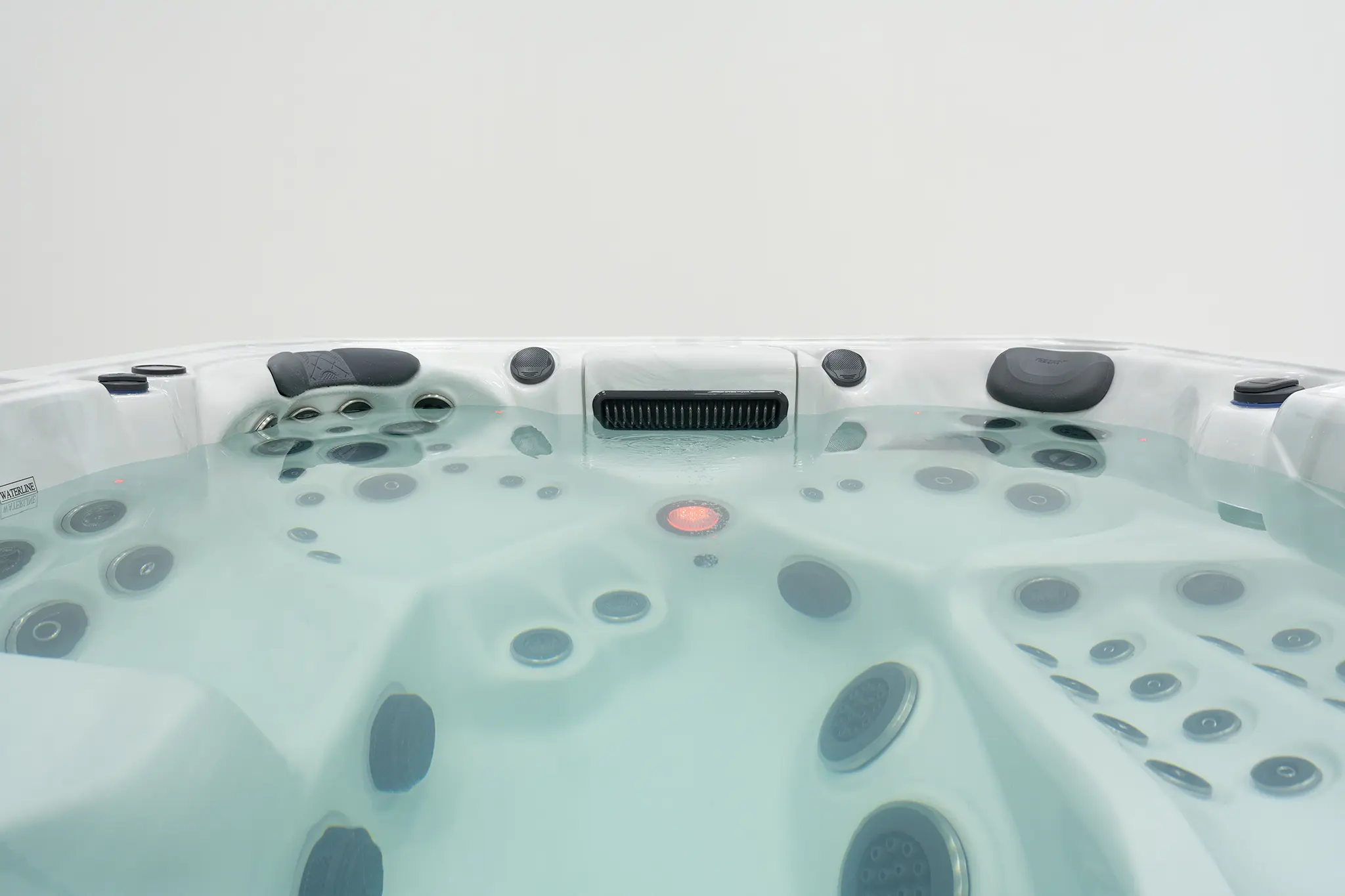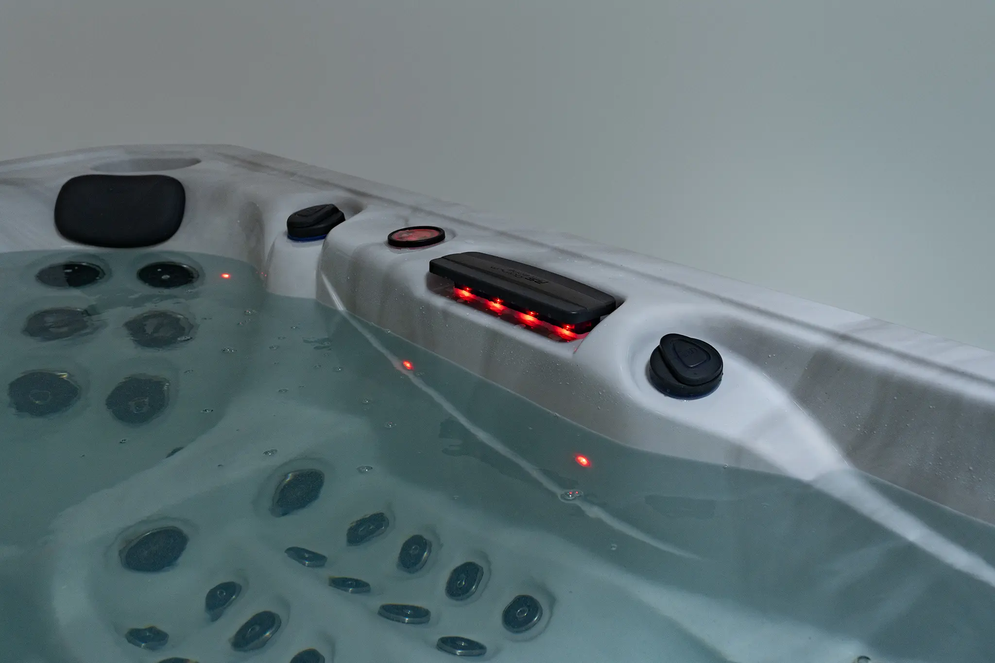 Insgesamt 99 präzise angeordnete Massagedüsen sorgen für eine sehr intensive und differenzierte Hydromassage. Das Pumpsystem kombiniert zwei 3-HP-Massagepumpen mit zwei zusätzlichen 2-HP-Pumpen. Diese Aufteilung ermöglicht eine gleichmäßige Druckverteilung und flexible Massagezonen. Ergänzt wird das System durch eine separate Umwälzpumpe.