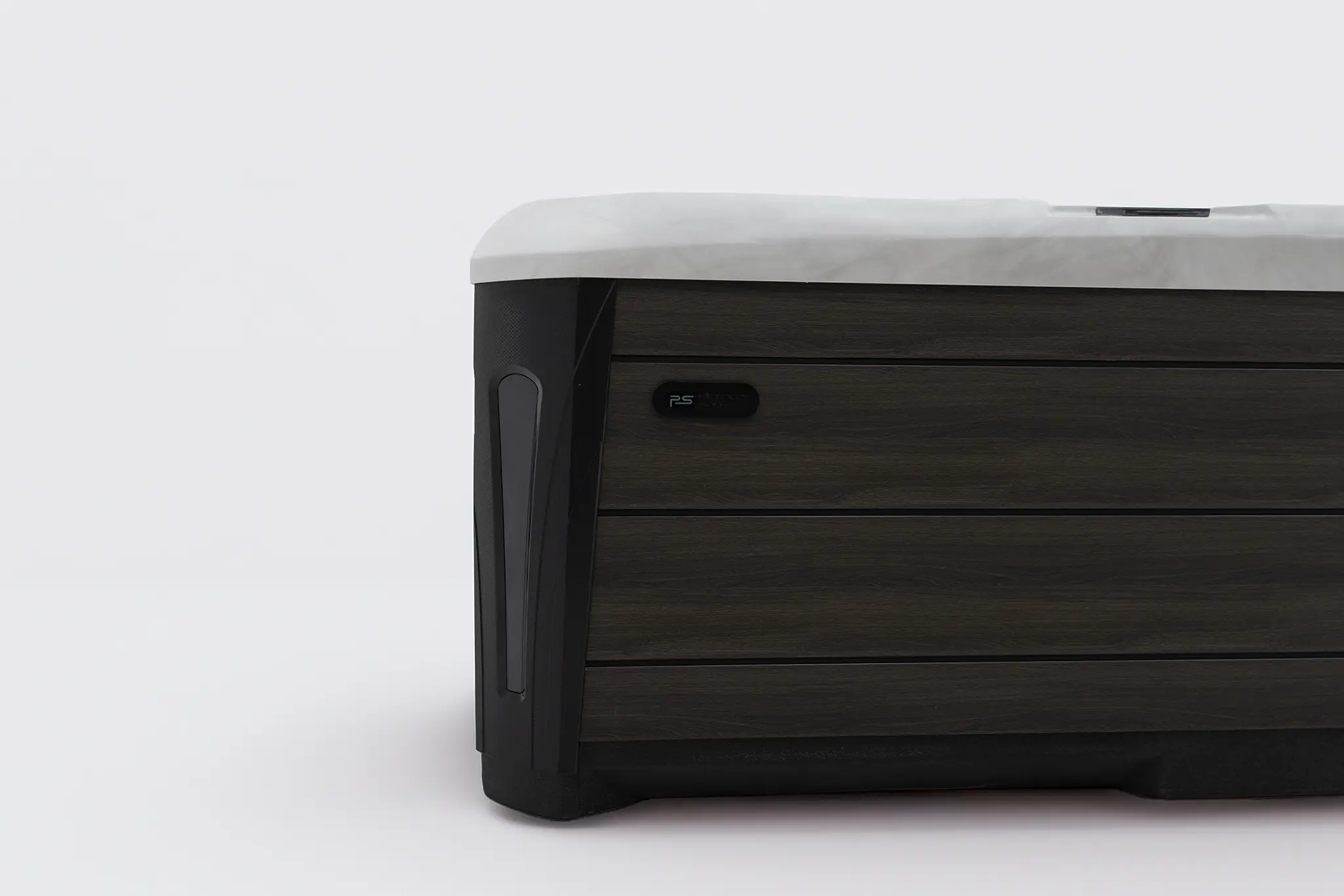 Das langlebige Acrylbecken ist pflegeleicht und in mehreren Wannenfarben erhältlich. Die graue WPC-Außenverkleidung sorgt für eine moderne, wetterbeständige Optik. Die integrierte 3-kW-Heizung gewährleistet eine konstante Temperaturregelung. Der Anschluss ist über 230 V oder 400 V (32 Ampere) möglich.