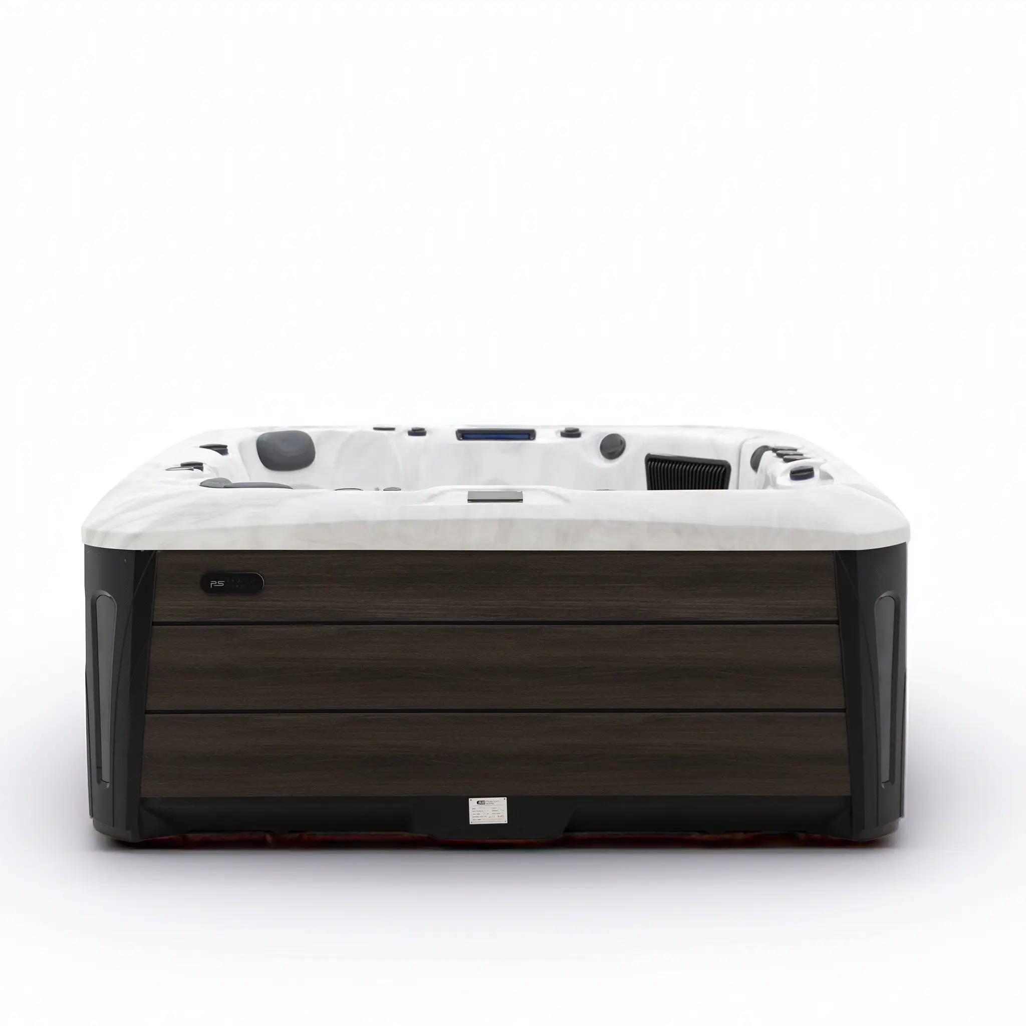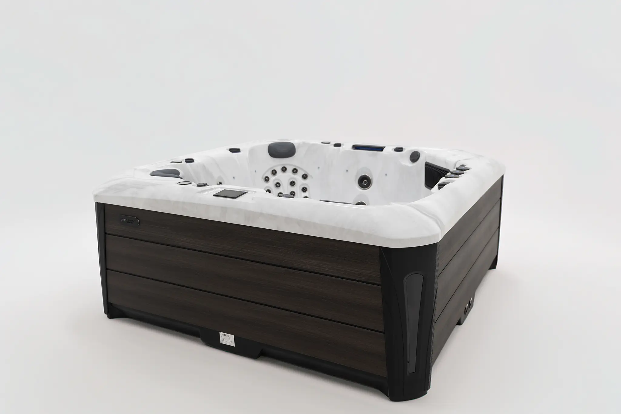 Mit Abmessungen von 223 × 223 × 94 cm bietet das quadratische Becken großzügigen Raumkomfort. Das langlebige Acrylbecken ist pflegeleicht und in mehreren Wannenfarben erhältlich. Die graue WPC-Außenverkleidung sorgt für eine moderne, witterungsbeständige Optik im Außenbereich.