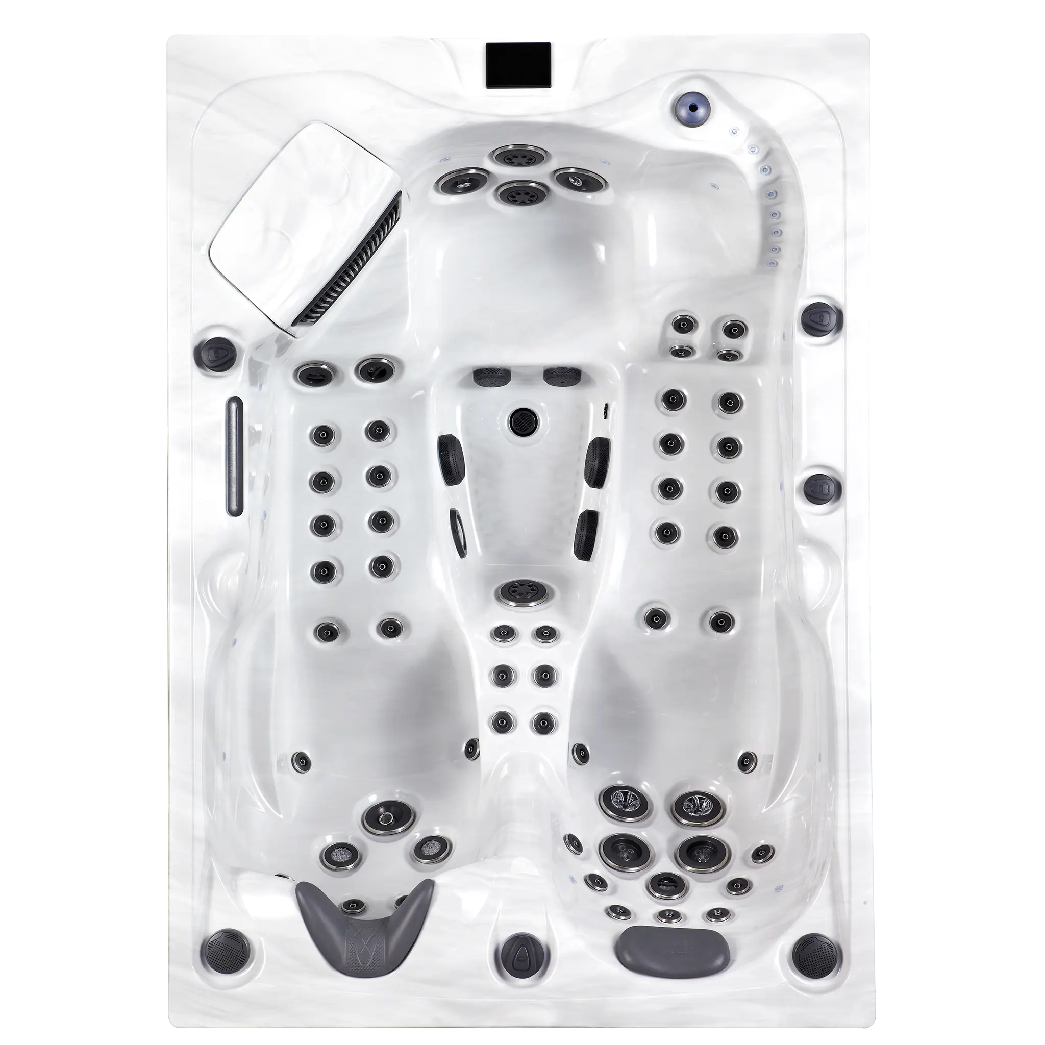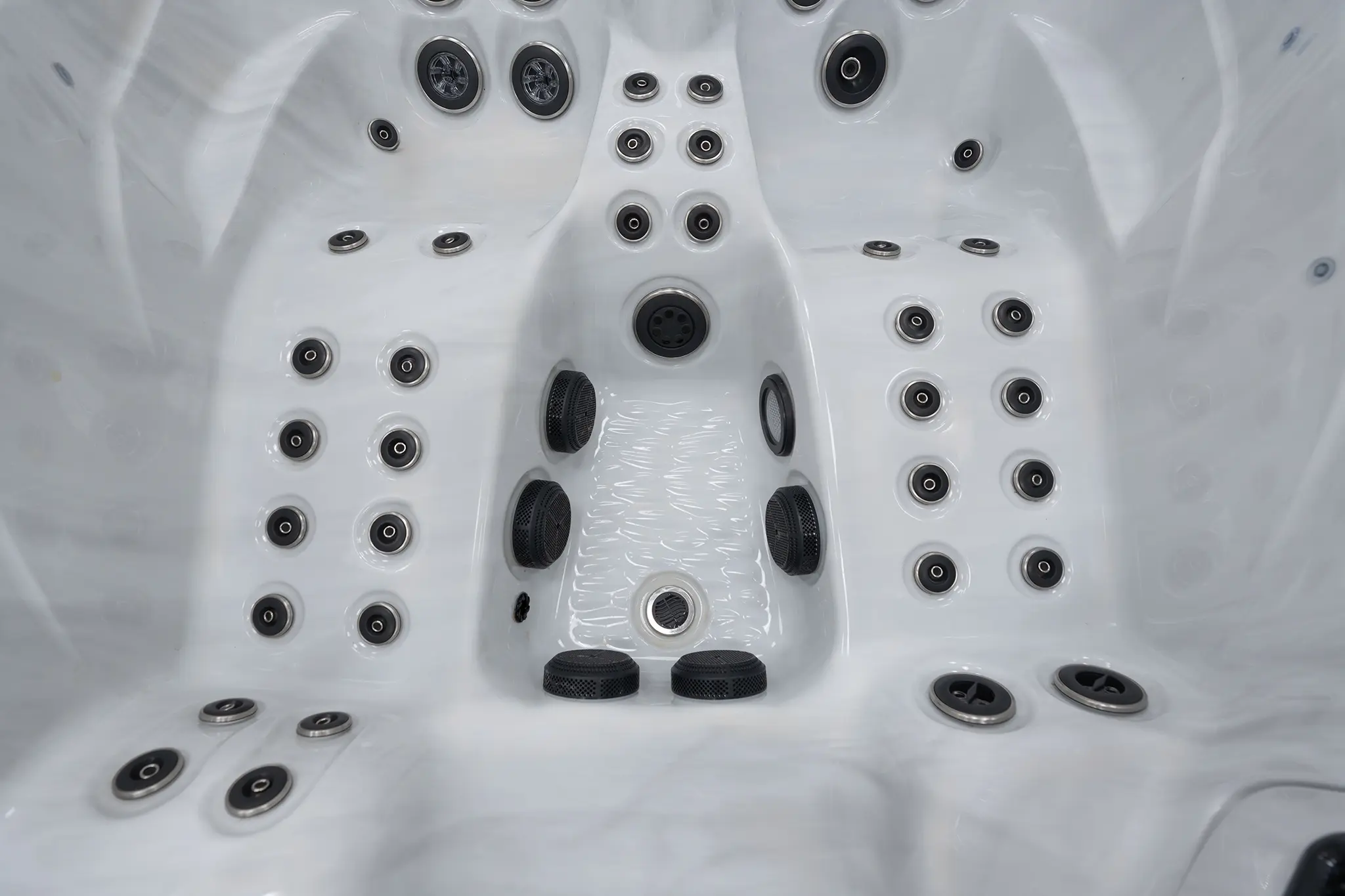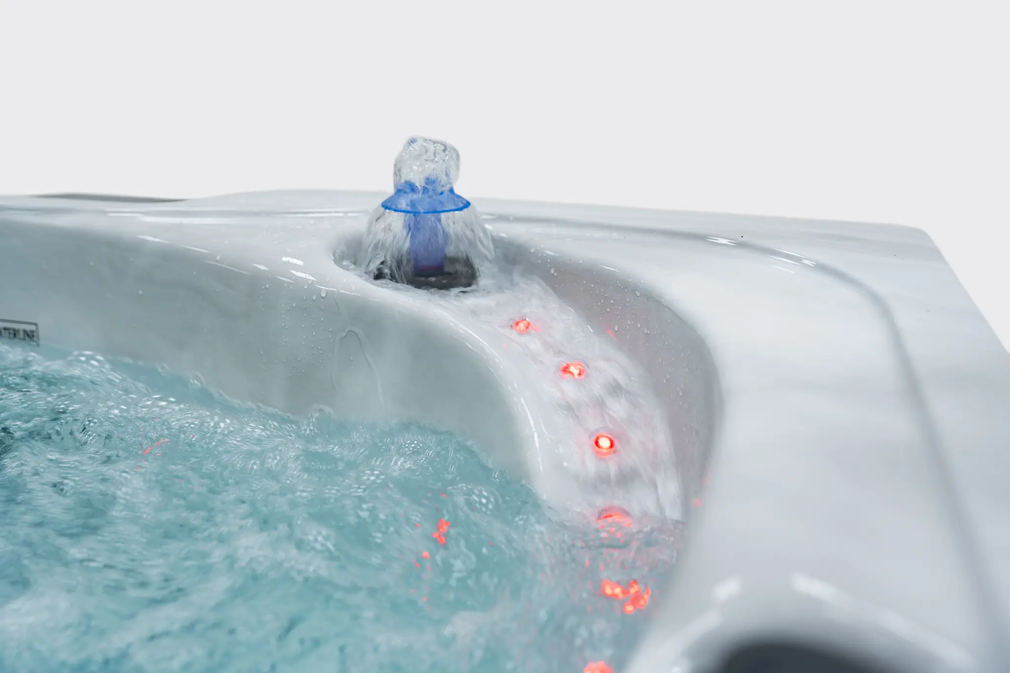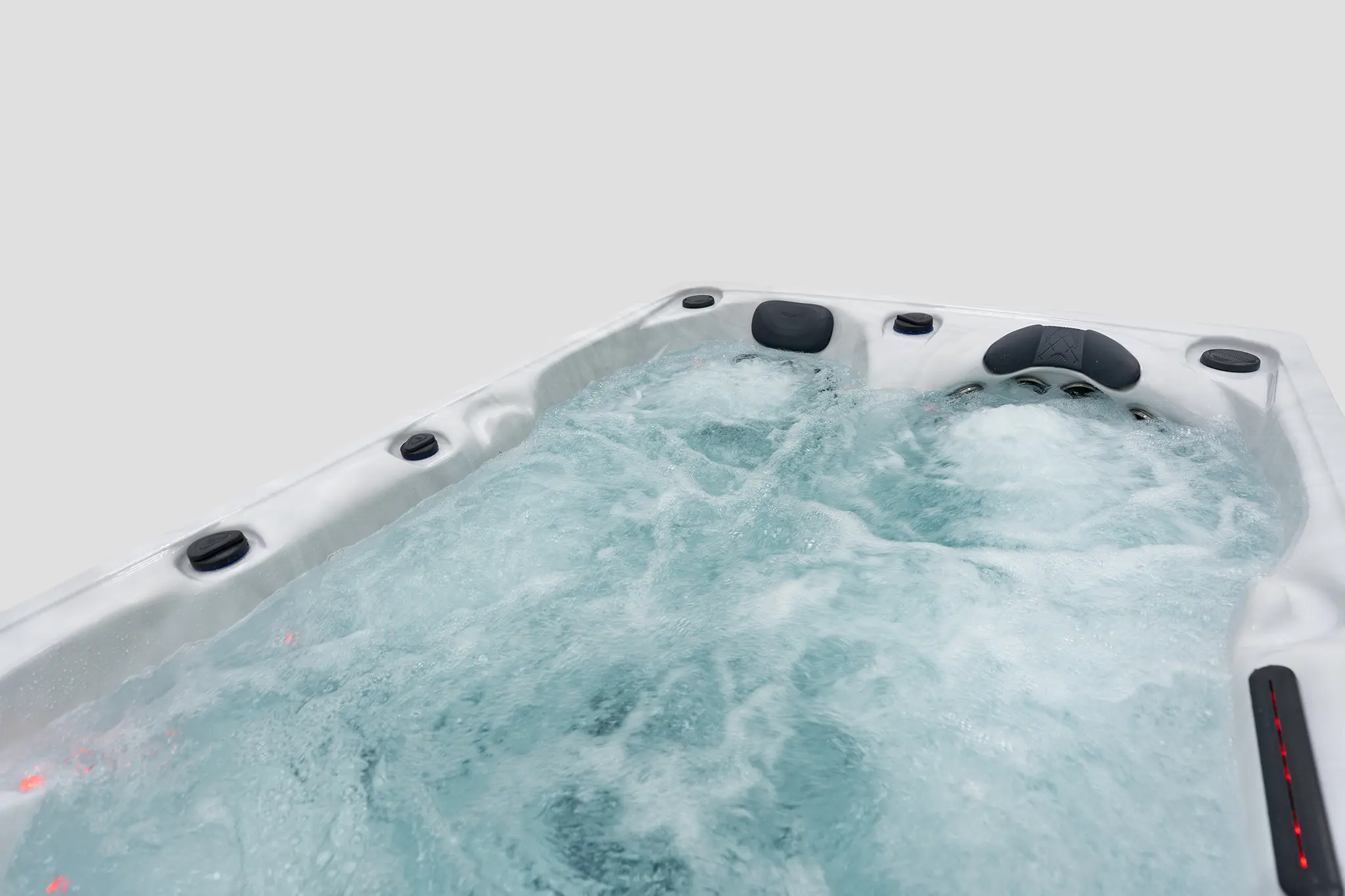 Für die intensive Hydromassage sorgen 64 präzise angeordnete Düsen, unterstützt durch zwei leistungsstarke 3-HP-Massagepumpen sowie eine separate Umwälzpumpe. Die integrierte 3-kW-Heizung gewährleistet eine schnelle und konstante Temperaturregelung. Der Anschluss kann flexibel über 230 V oder 400 V erfolgen.