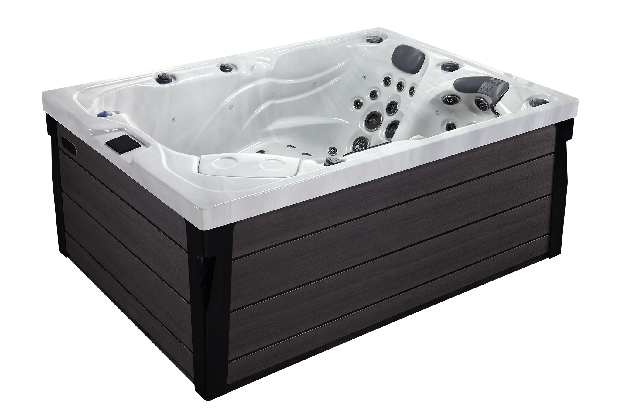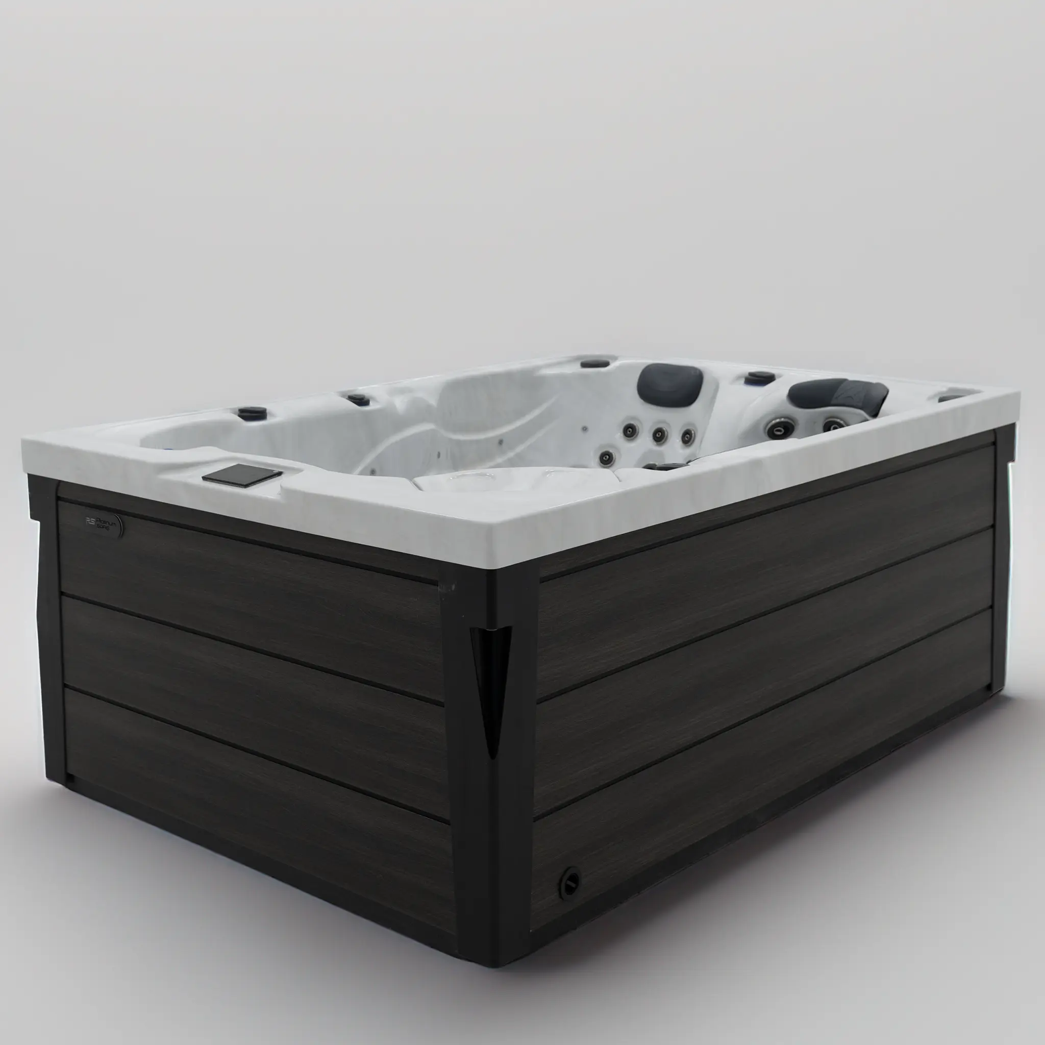 Mit seinen Maßen von 220 × 156 × 90 cm fügt sich der Topaz Whirlpool flexibel in verschiedene Außenbereiche ein. Die Kombination aus quadratischer und rechteckiger Bauform ermöglicht eine platzsparende Integration auf Terrasse oder im Garten. Das langlebige Acrylbecken ist pflegeleicht und in mehreren eleganten Wannenfarben erhältlich. Die graue WPC-Außenverkleidung sorgt für eine moderne und wetterbeständige Optik.